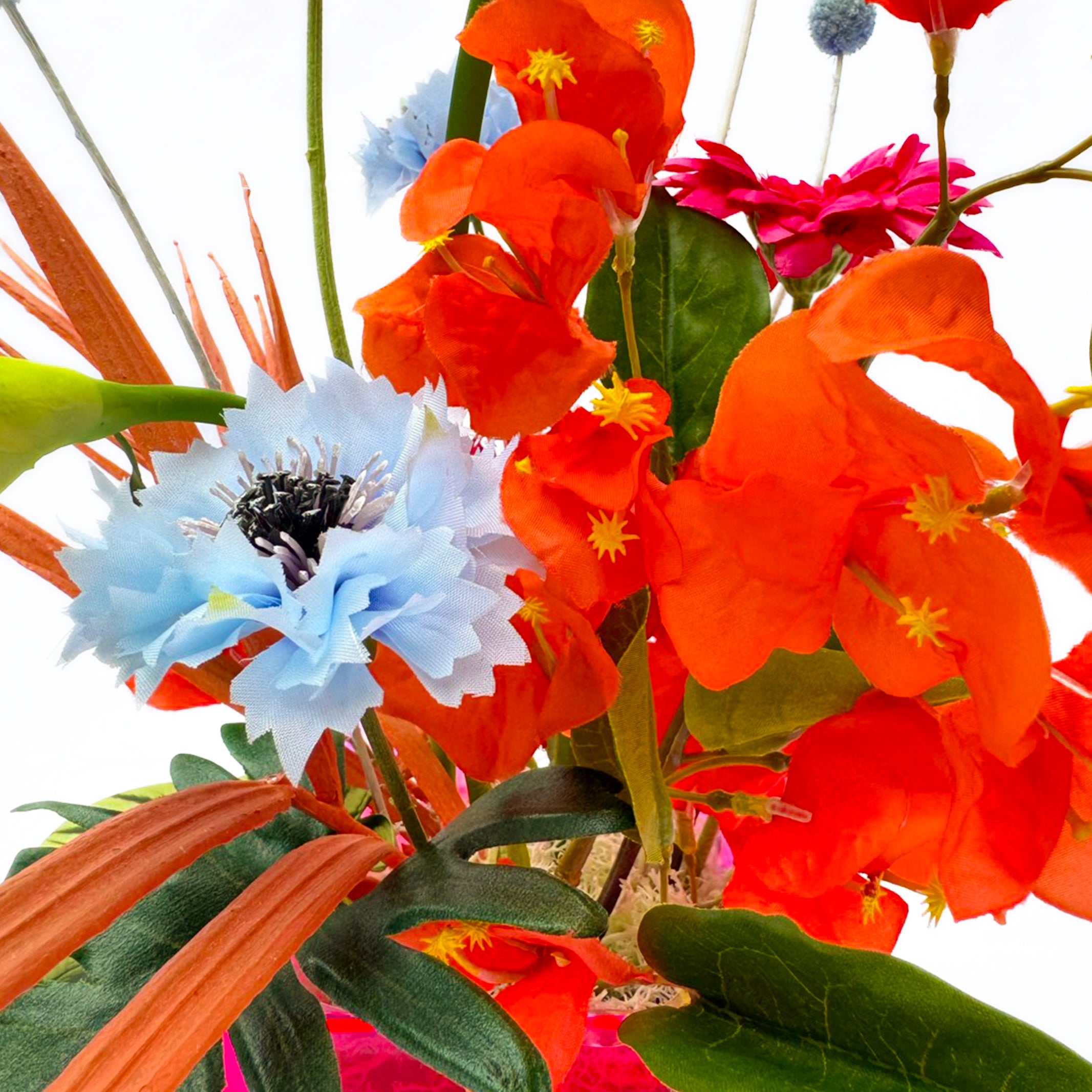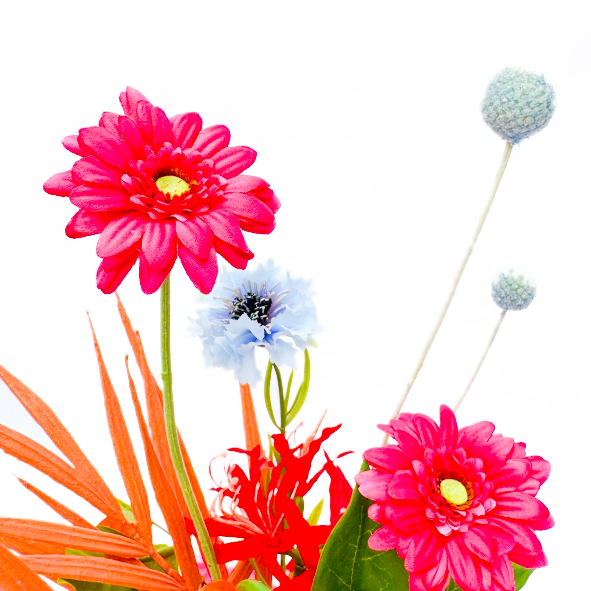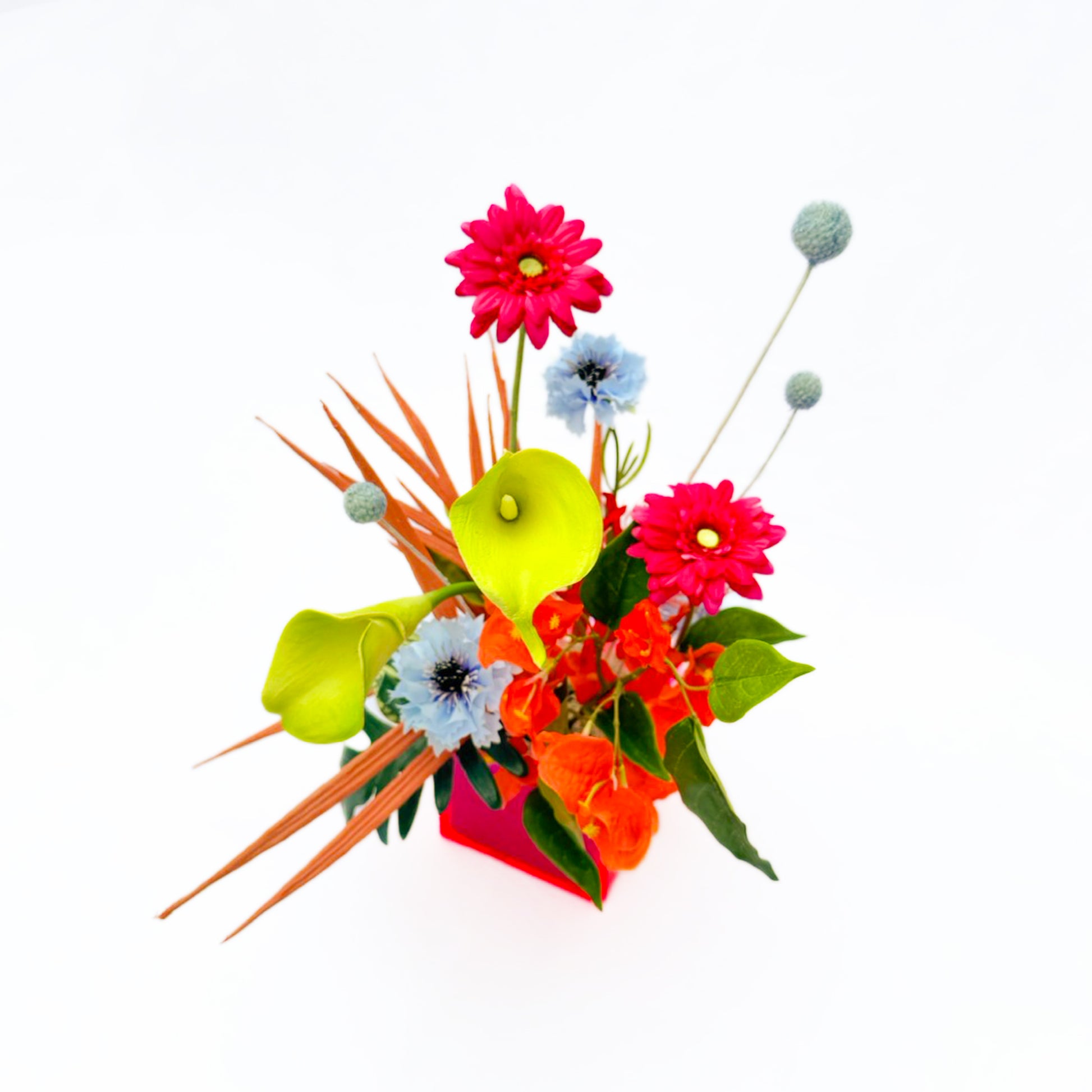 オリエンタルな雰囲気をまといながら、クールでスタイリッシュに仕上げたアレンジメント。可愛らしいオレンジのブーゲンビリアやピンクのガーベラ、ブルーのコーンフラワーに、不思議な魅力を放つクラスペディアが華やかさを添えます。印象的な黄緑色のカラーは、知的で繊細な印象を演出。オレンジのヤシの葉、クッカバラ、ゼラニウムの葉などのグリーンが瑞々しさを引き立て、全体を艶やかに纏めています。ピンクのポットとホワイトグリーンのモスも、お洒落なアクセントに。落ち着いた空間に彩りを添えるアイテムとして、店舗のインテリアや大切な方へのギフトにおすすめです。<※付属品:ポット、モス*カラーはお選び頂けません。商品画像をご参照ください>