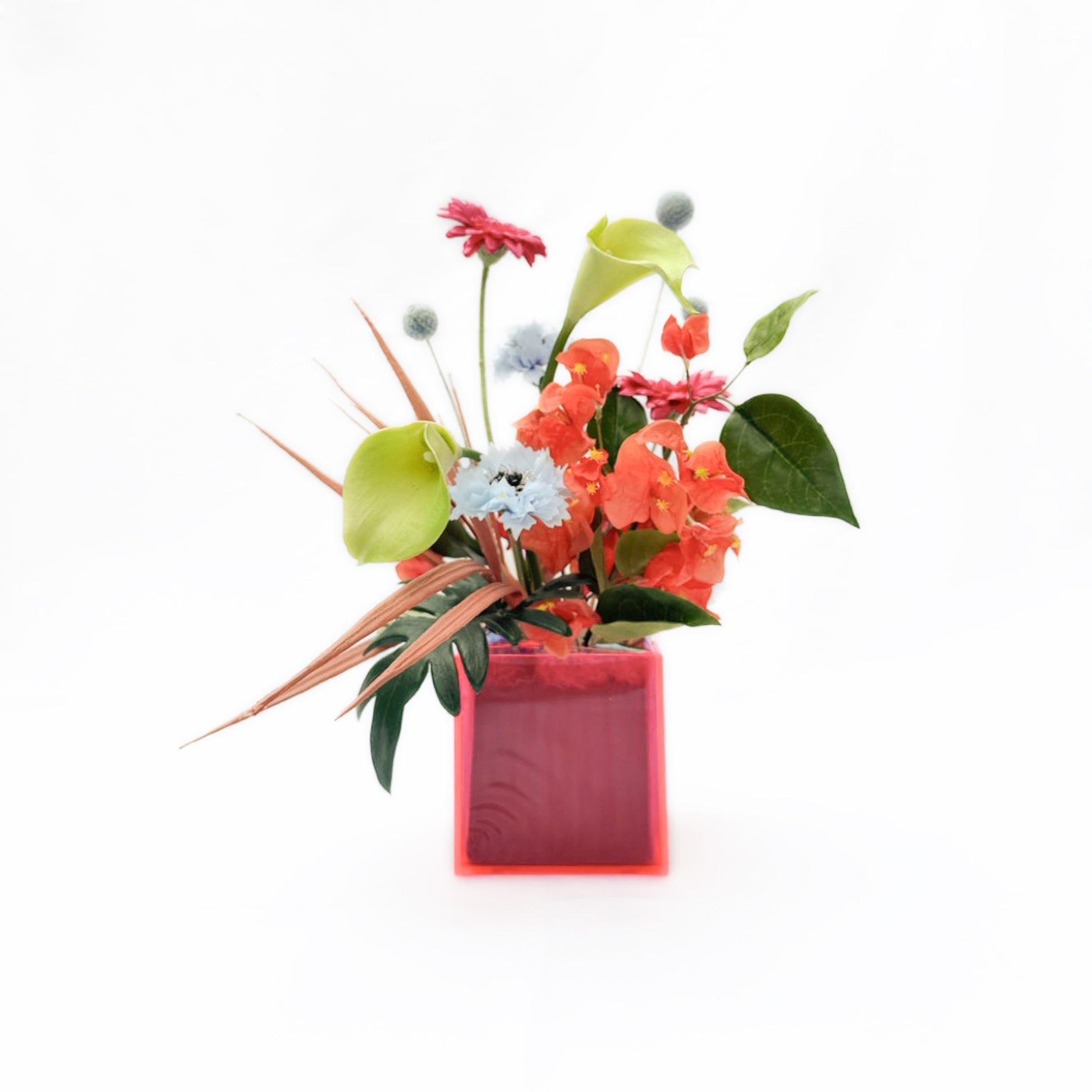 トランスペアレントなボックス型ポットに、ビビッドなネオンカラーを施し、オーロラフィルムとカラフルなモス(苔)でアクセントを加えた、ポップでファッショナブルなアレンジメントです。