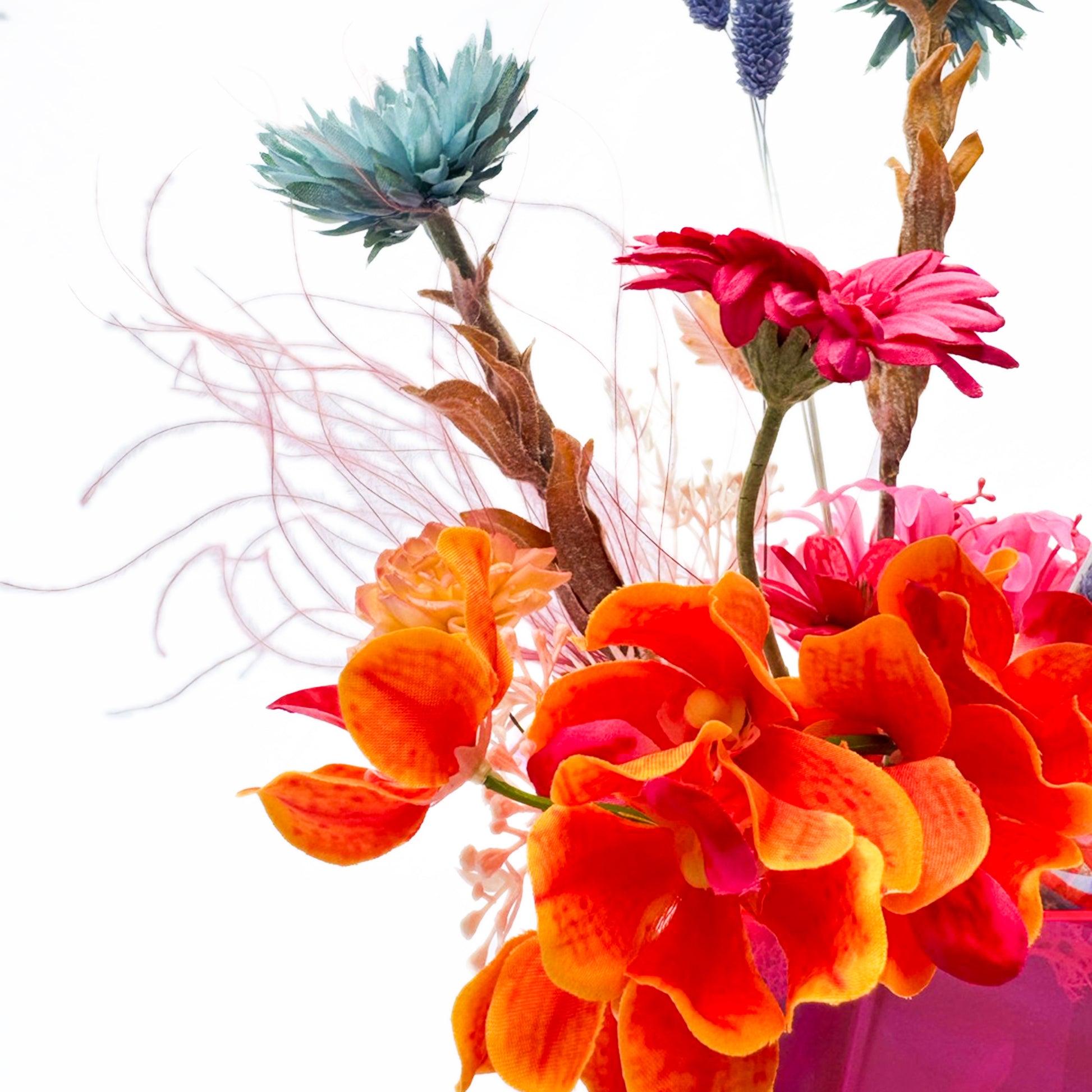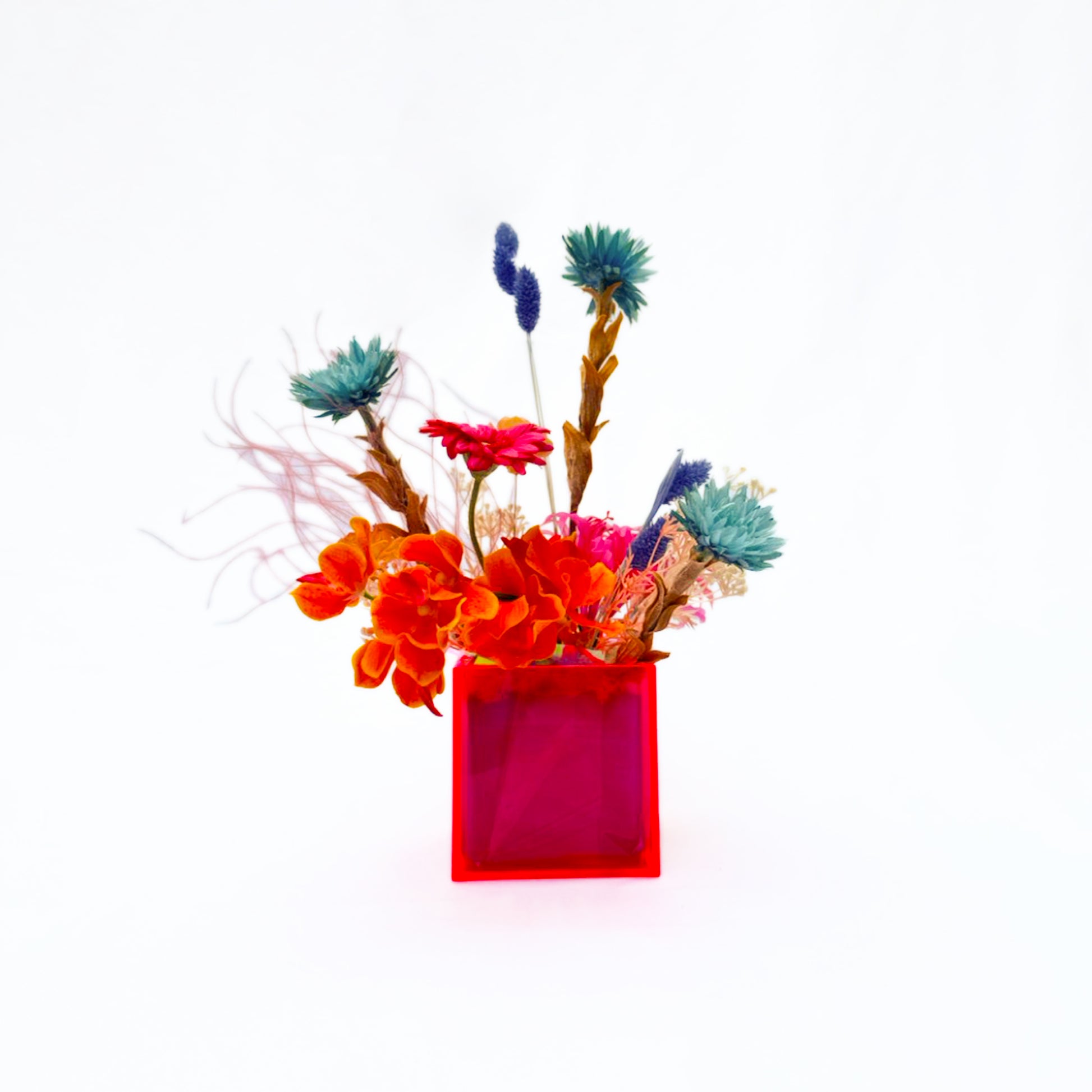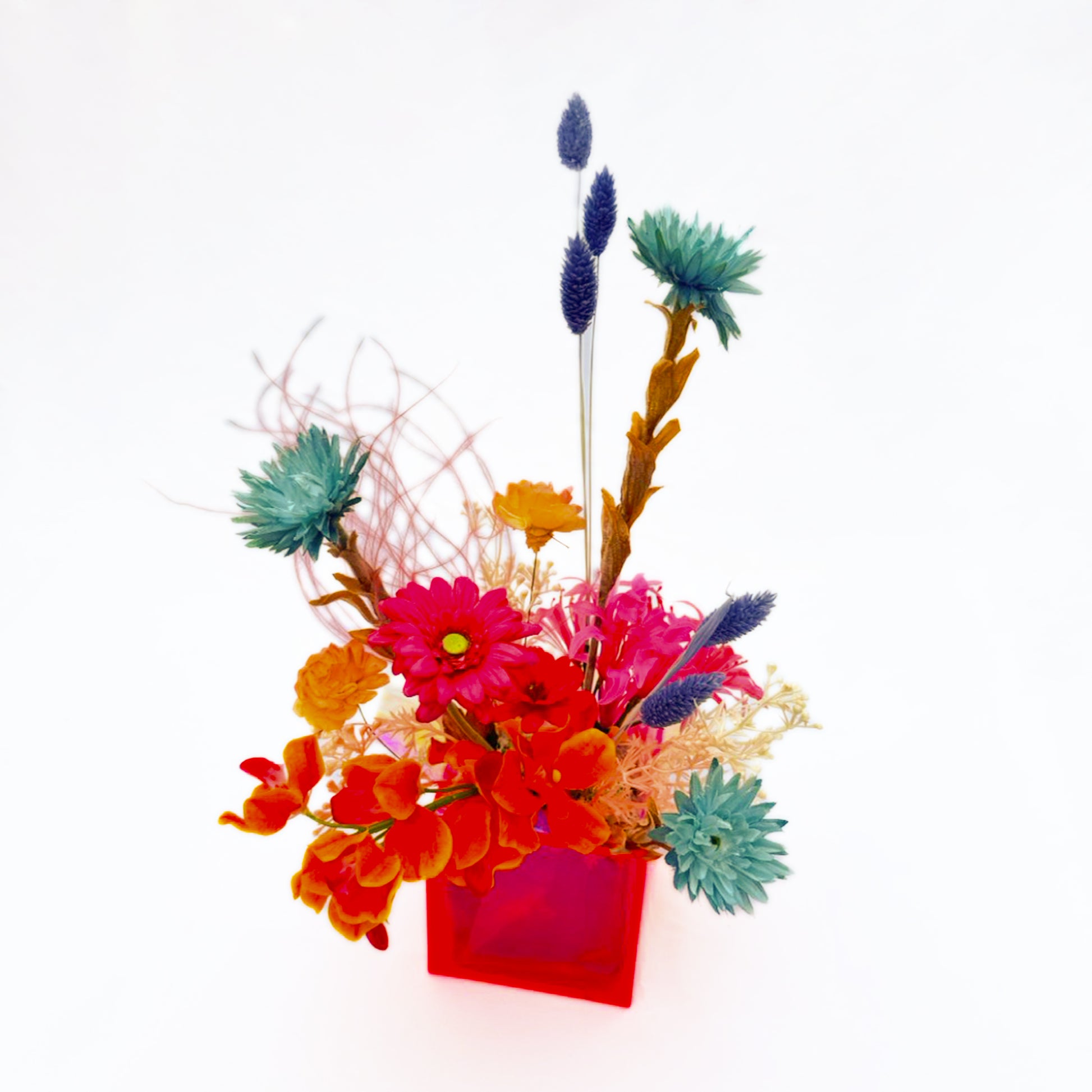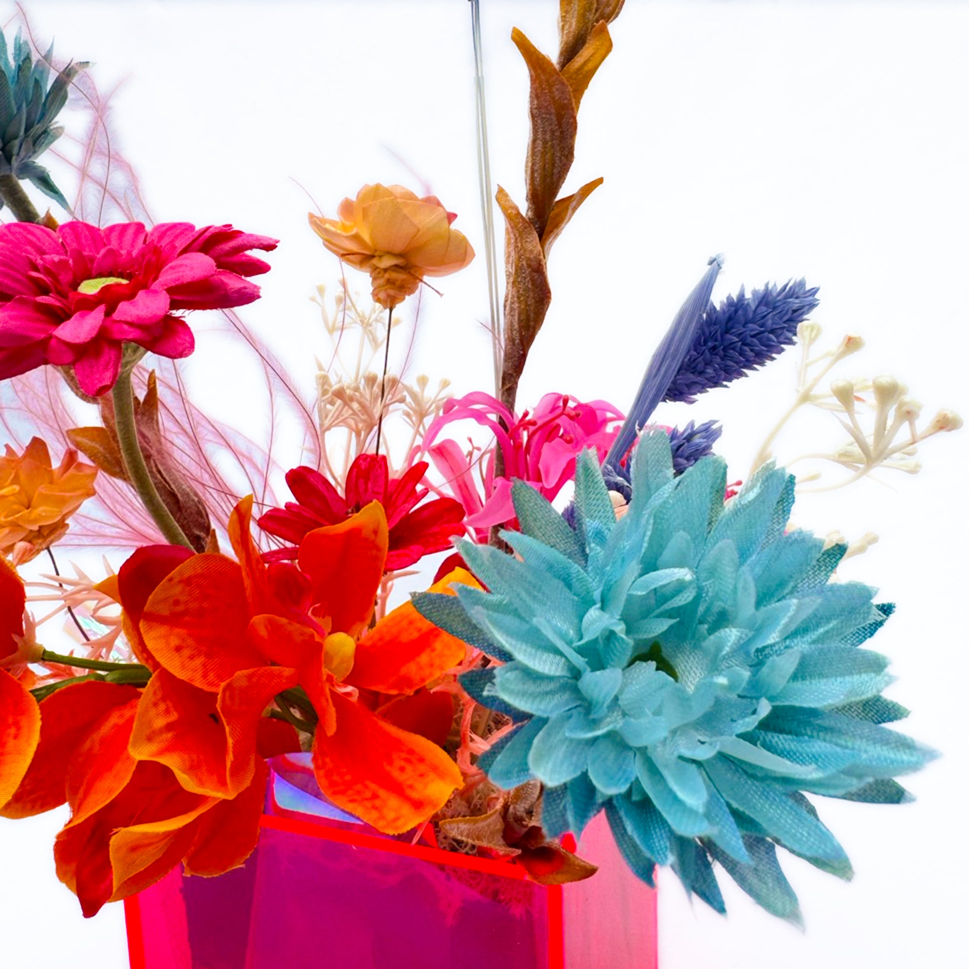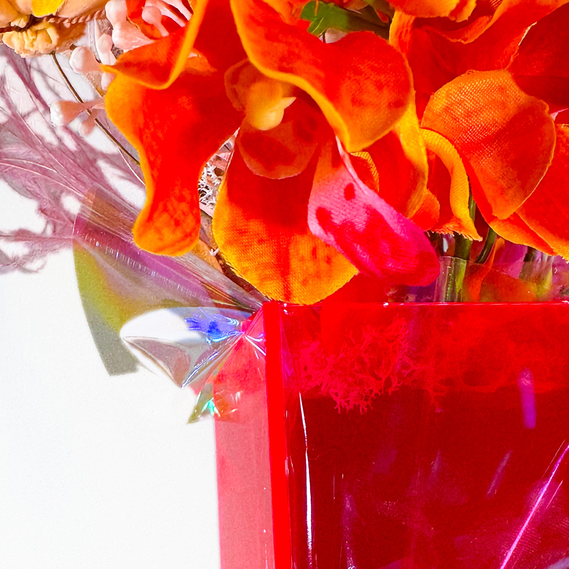 トランスペアレントなボックス型ポットに、ビビッドなネオンカラーを施し、オーロラフィルムとカラフルなモス(苔)でアクセントを加えた、ポップでファッショナブルなアレンジメントです。