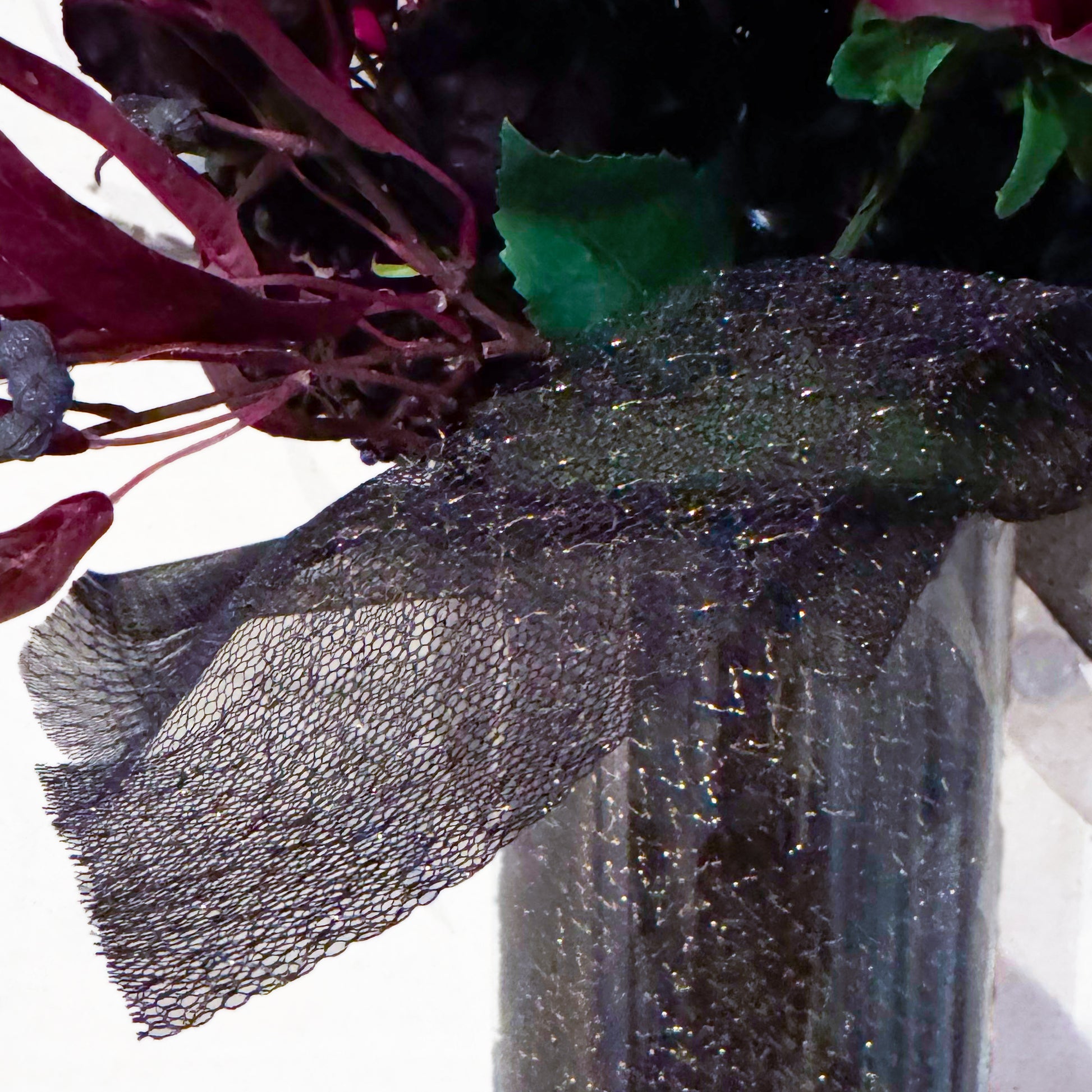 透明なガラスベースと繊細なブラックチュールが、まるで夜空に浮かぶような気品を演出します。