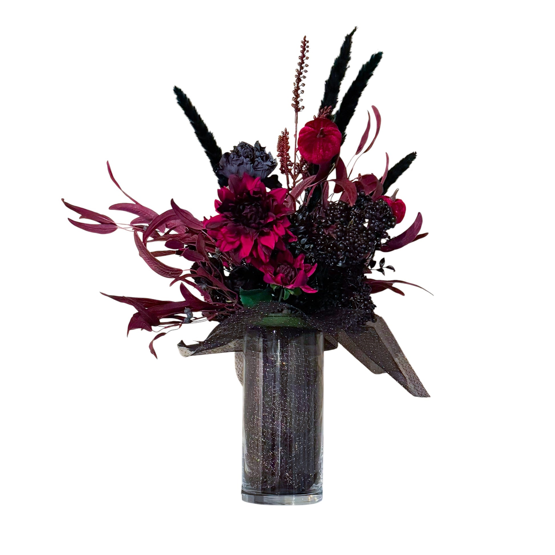 深紅のダリアやボルドーの花々を中心に、ブラックの実物やスモーキーな葉を合わせたドラマティックなアレンジメント。