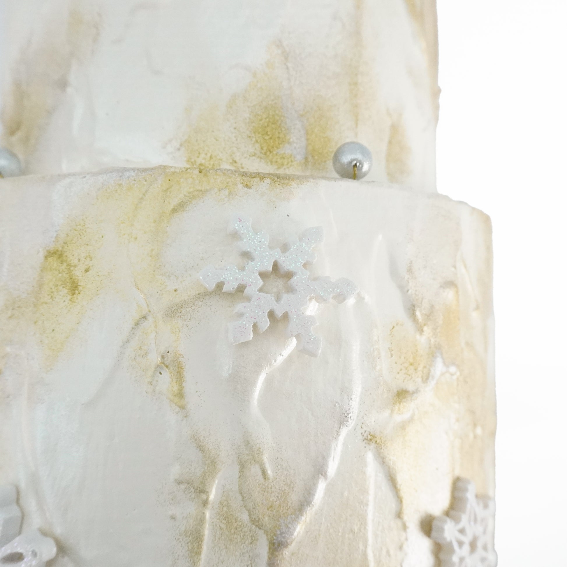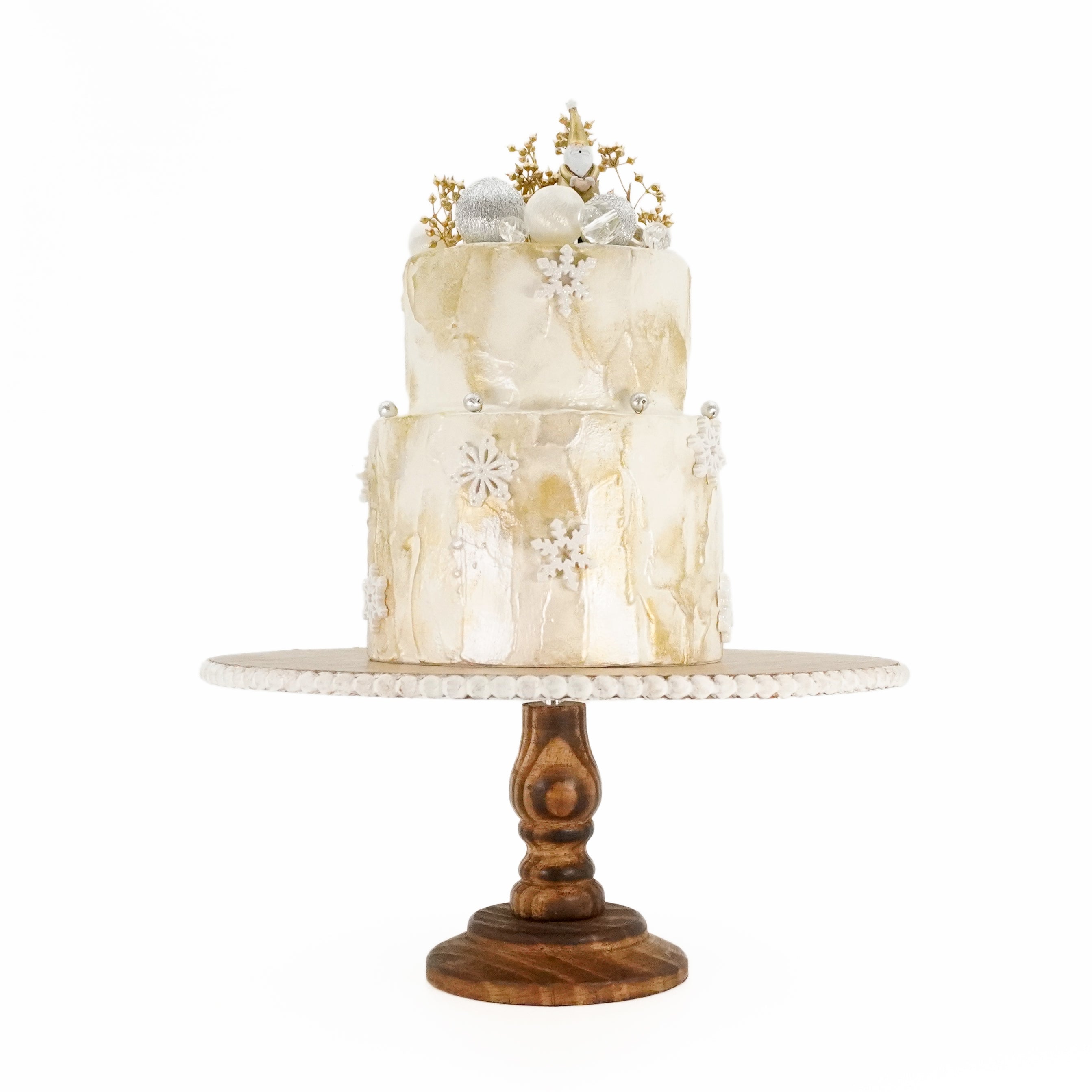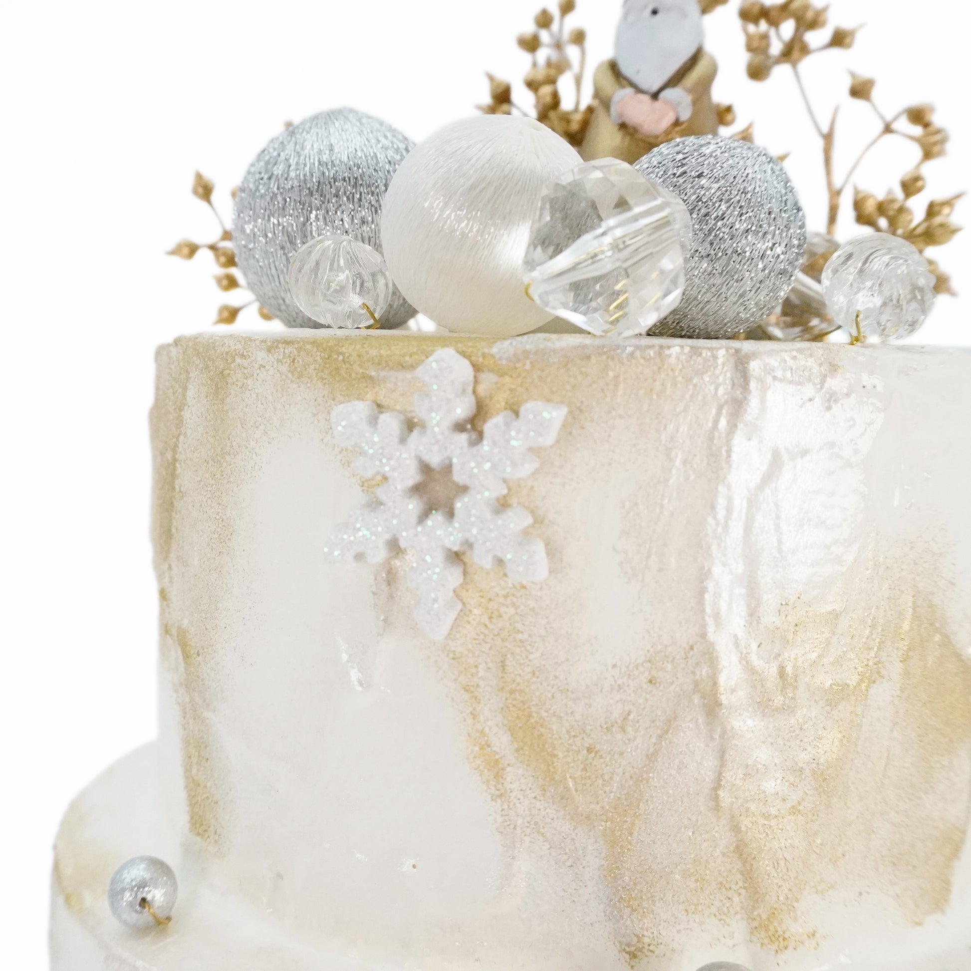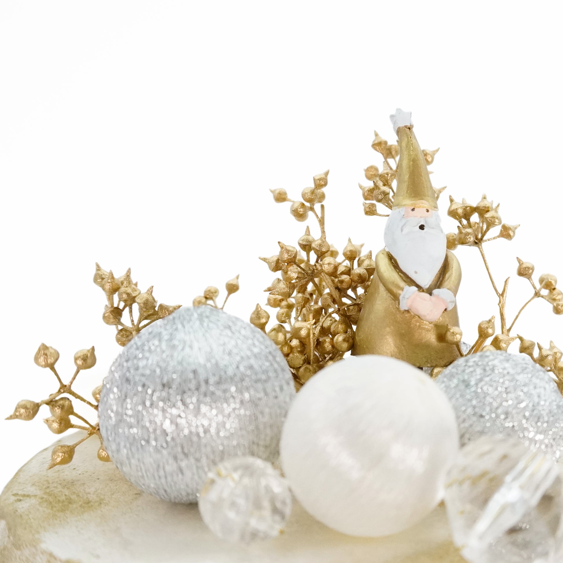 ゴールドのニュアンスカラーが美しく輝くクレイケーキです。可愛らしい表情をしたゴールドのサンタと雪の結晶の装飾が、華やかさをより一層演出します。この冬のパーティーシーンで空間を華やかに彩り、目も楽しませてくれる一品です。<注:ケーキ台は付属しません。この商品は食べられません><注:ドライフラワーは乾燥しているため、散りやすいものや壊れやすい場合がございます。繊細な商品なため飾る場所や季節等により、ご購入後の色の変化や劣化具合は異なります。>