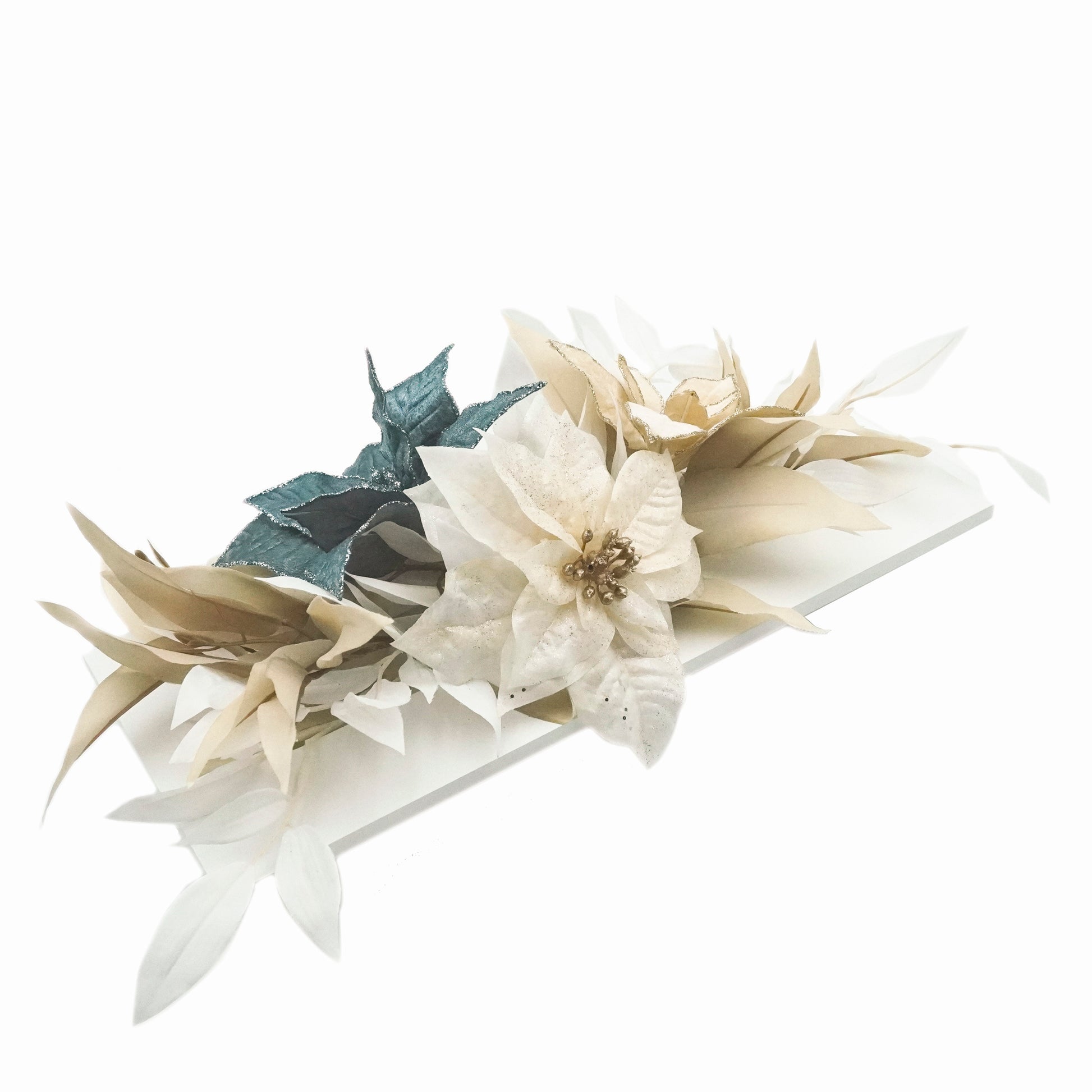 ヌーディーカラーの白とベージュの葉が美しく、淡いブルーのポインセチアをポイントに華やかに咲くアレンジメント。白いフレームとの相性も抜群で、シックで上品な雰囲気を演出でクリスマスの食卓を華やかに彩ります。