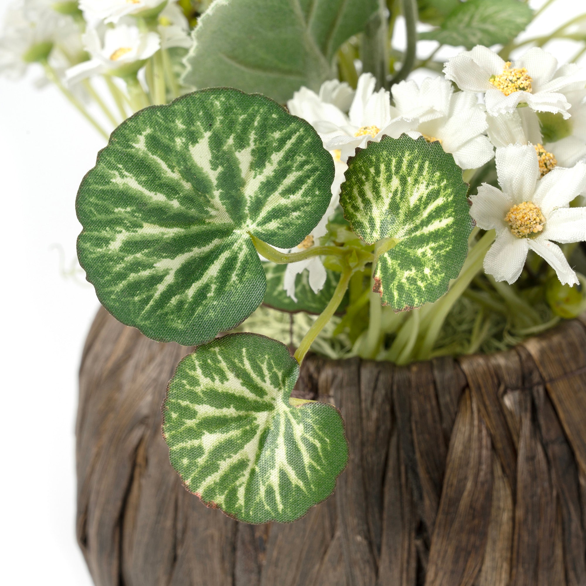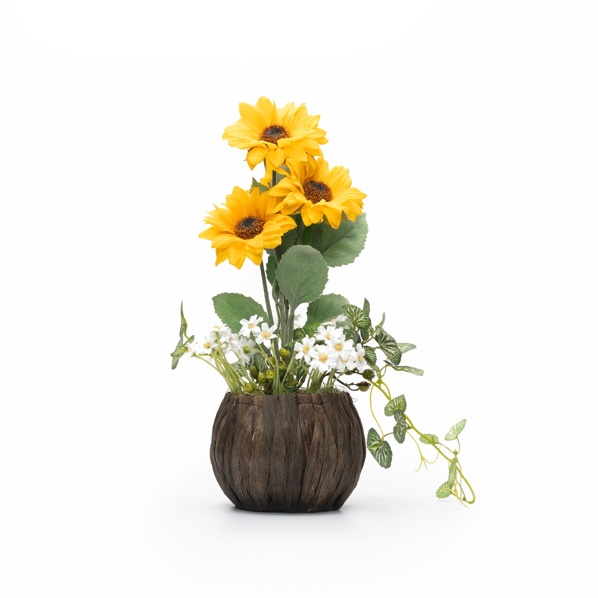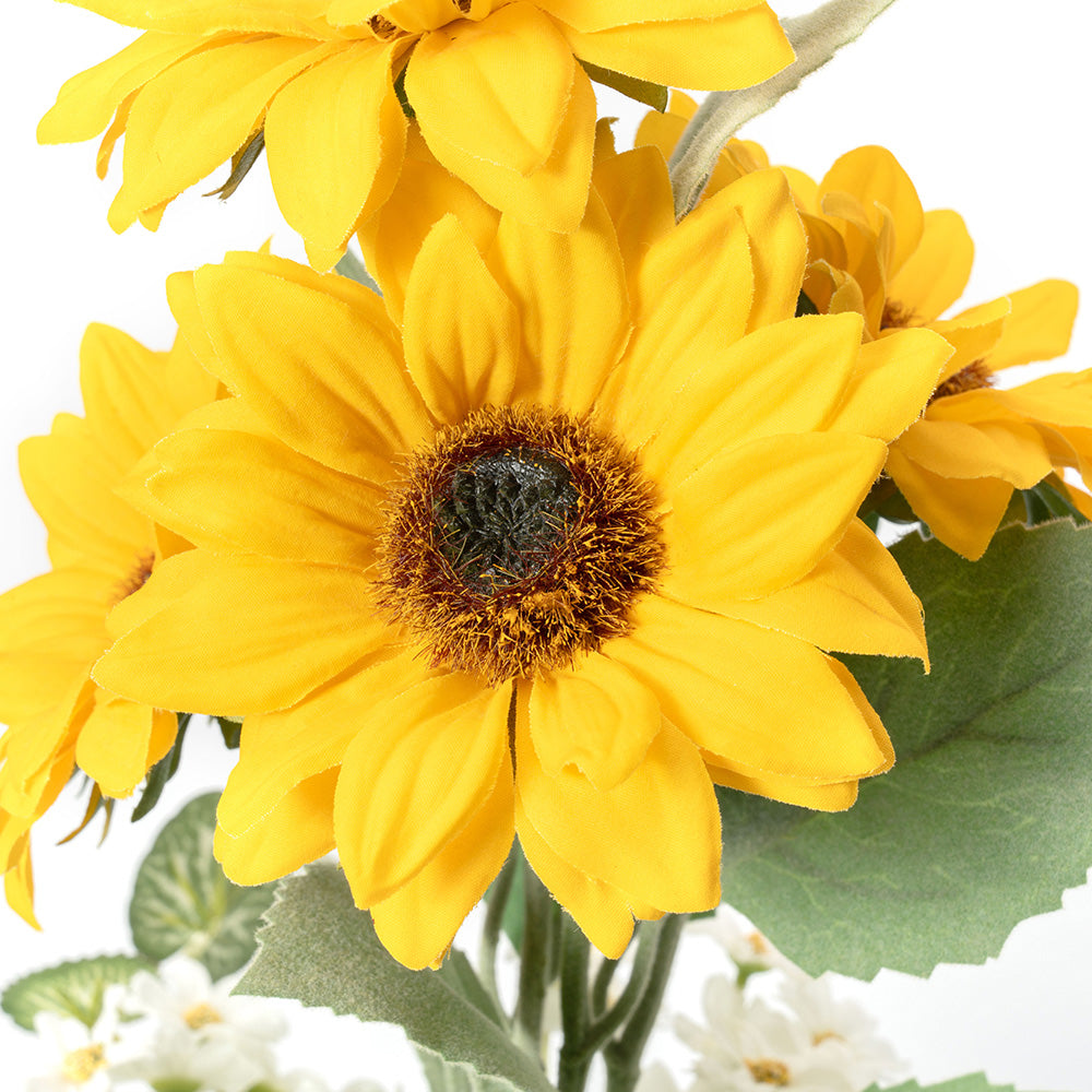 存在感のある向日葵に、愛らしいデイジー、清楚なユキノシタが気品を醸し出すアレンジメント。生花の向日葵は枯れる際、下向きになり、寂しい印象を与えがちですが、このアーティフィシャルフラワーは長持ちするため、お部屋のインテリアとして使いやすいです。夏だけでなく、気分を上げたい時にもおすすめです。