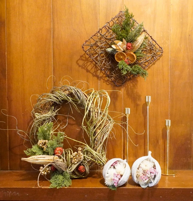 - 花材:ドライフルーツオレンジ、ドライオクラ、ドライ唐辛子、リリー、サイプレス(ヒノキ) ・その他:フレーム、網