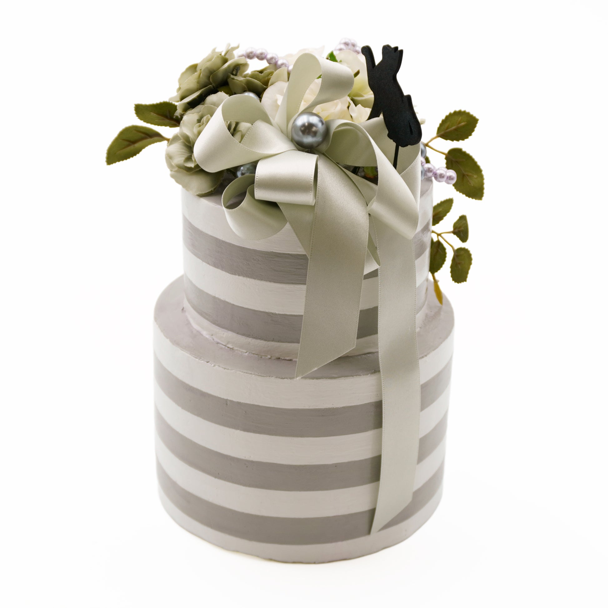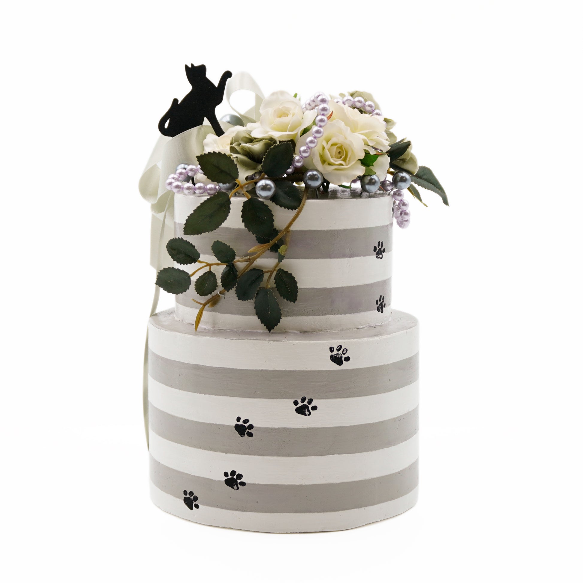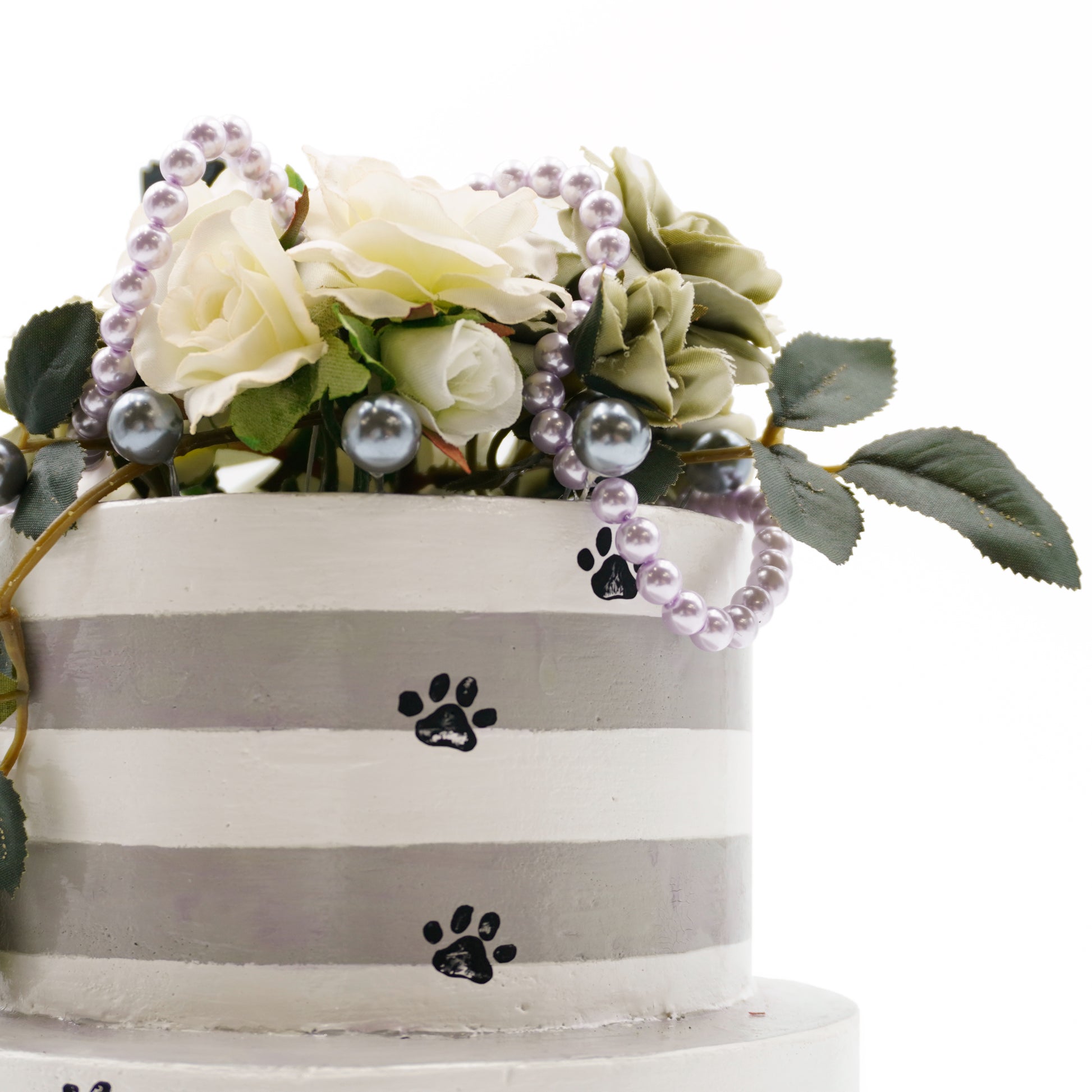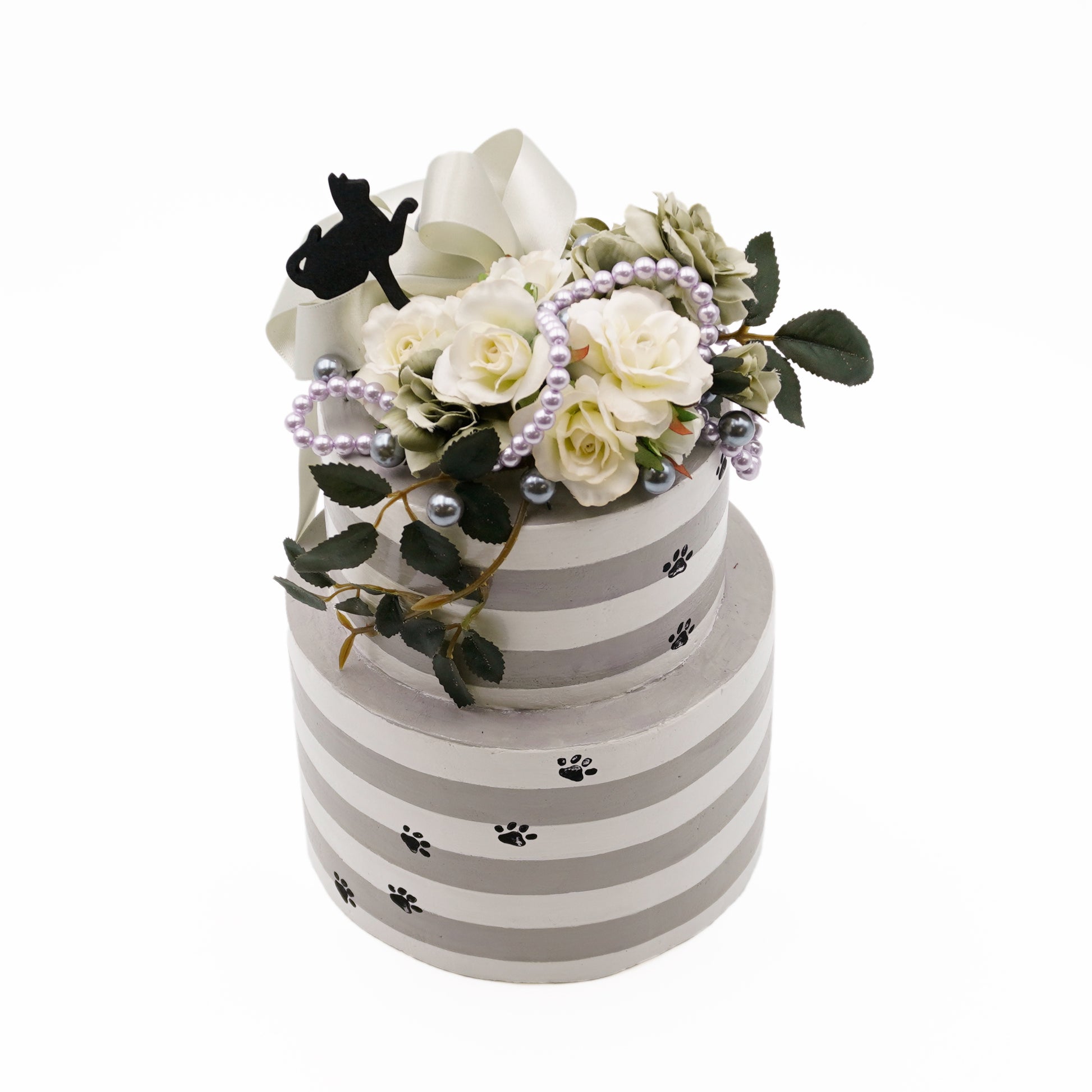 美しいバラをモチーフに、パープルパールの華やかさとシルバーピックの高級感を兼ね備えつつ、ネコピックとリボンの可愛らしさがアクセントに加えられたクレイケーキ。大胆なボーダー柄に軽やかなネコの足跡が遊び心をくすぐる一品で、ハロウィンパーティーのデコレーションや撮影の風景に華やかさをプラスされたい時、特別なアイテムをお探しの際におすすめです。<注:この商品は食べられません>