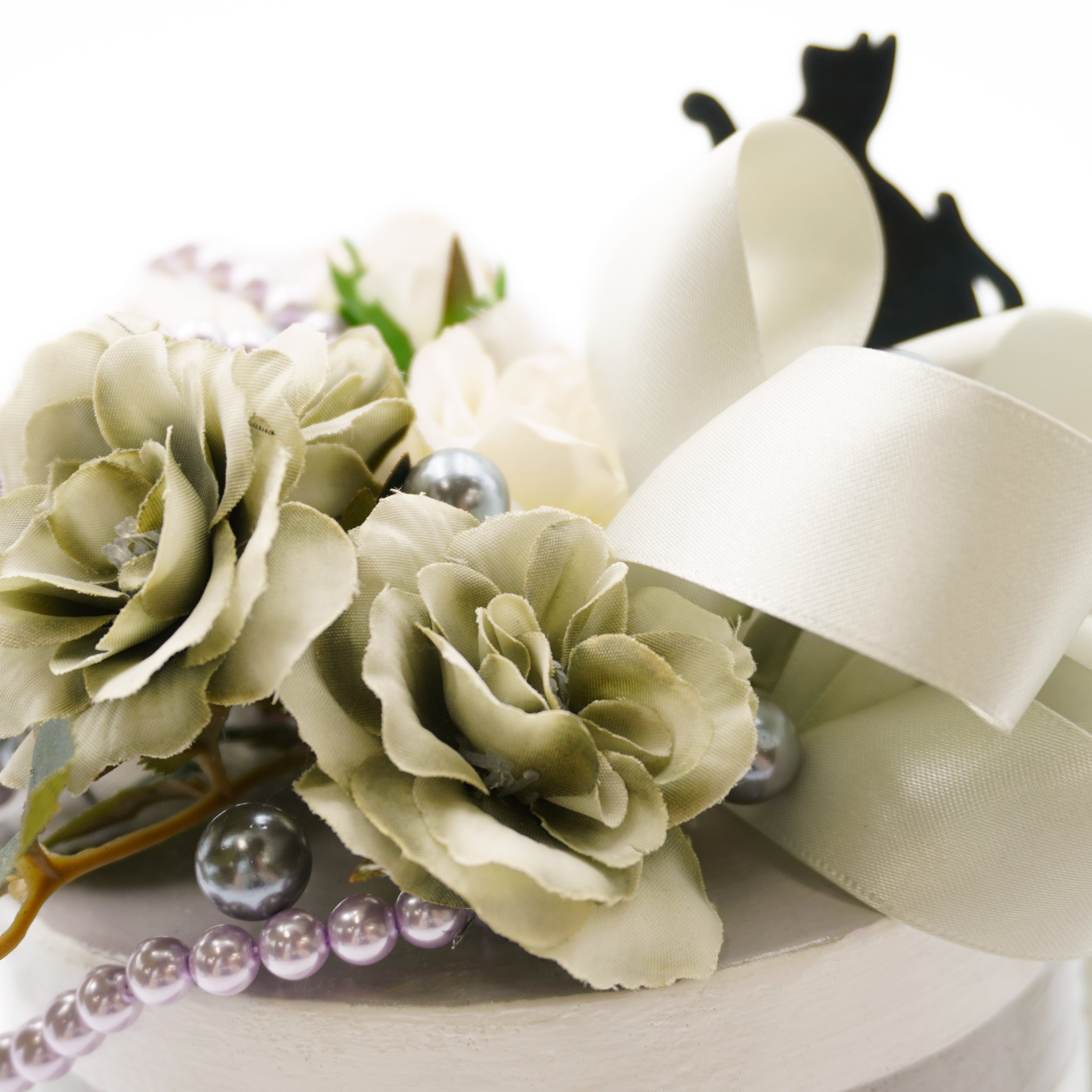- スチロール/造花:バラ/パープルパール/シルバーピック/ネコピック/リボン