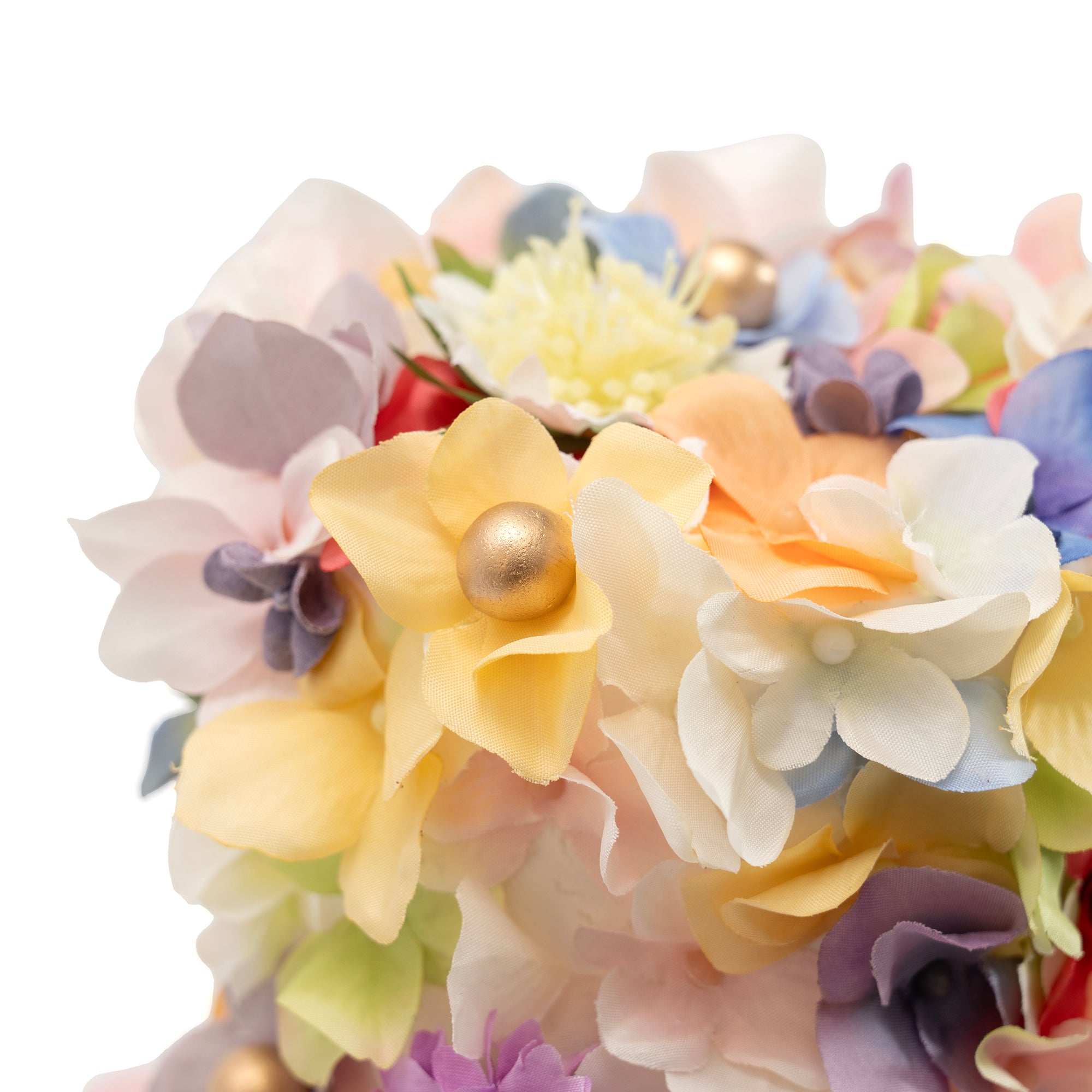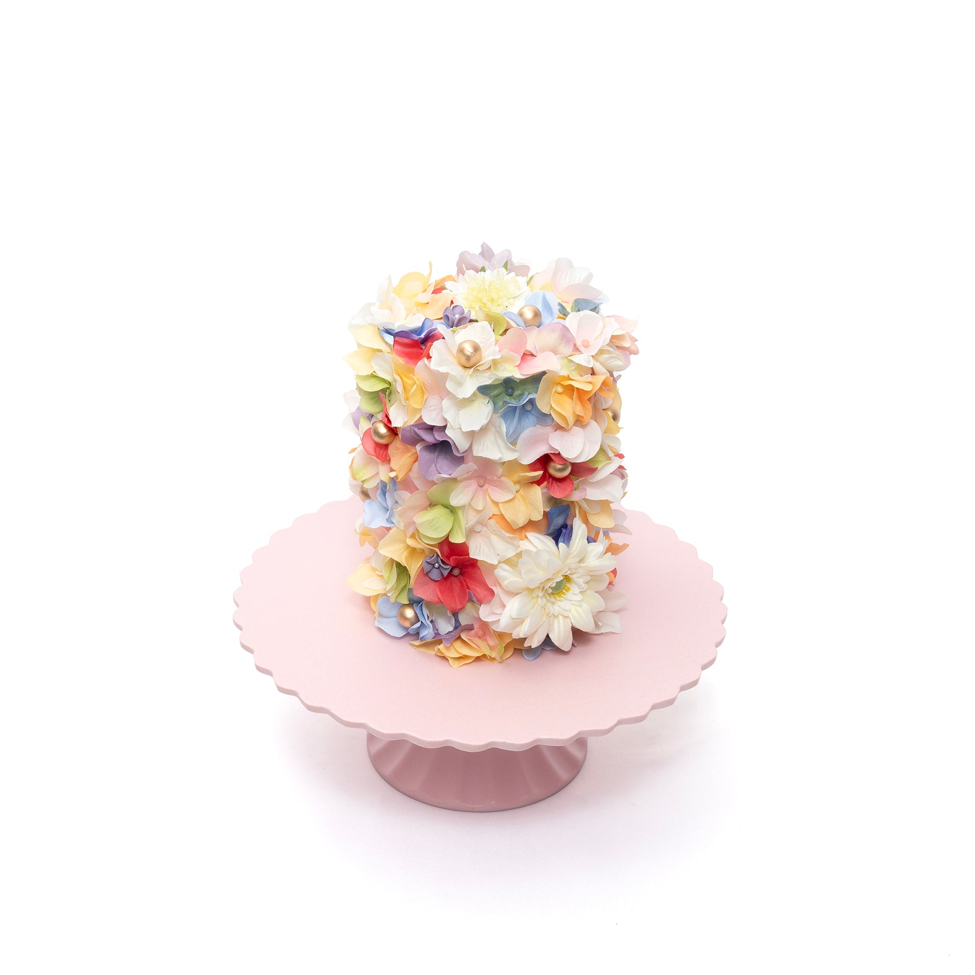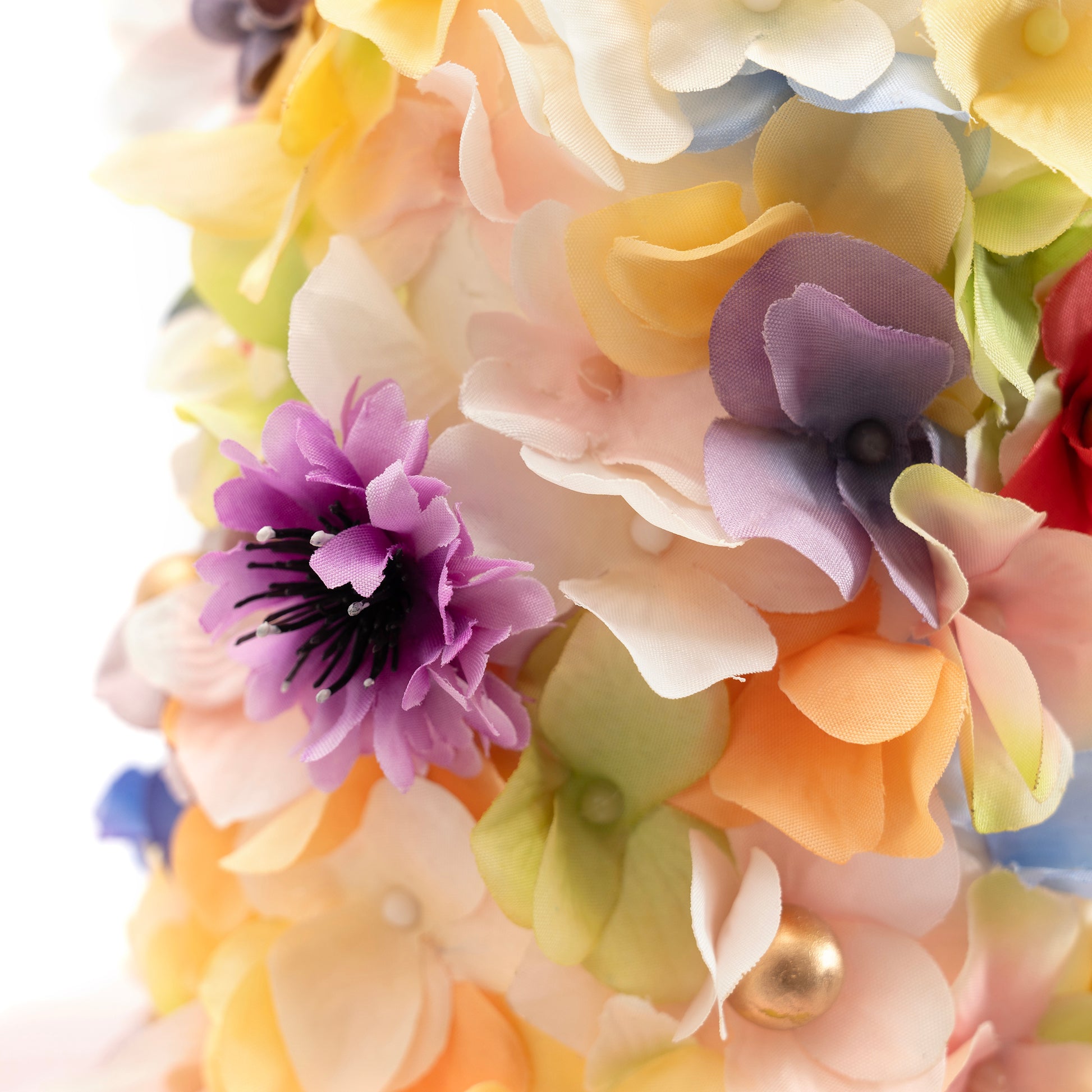 ピンク、イエロー、ブルー、パープル、ホワイトなどカラフルなガーベラ、スカビオサ、ヤグルマソウなどの花びらがぎっしり詰まった豪華なクレイケーキ。まるでオートクチュールのドレスのように繊細かつ華やかなスタイルに誰もが魅了されそう。ウェディングパーティー、バースデーパーティーなどお祝いの席を盛り上げるデコレーションとして、撮影小物として揃えて頂きたいアイテムです。<注:ケーキ台は付属しません。(別売り可能)この商品は食べられません。ケーキ裏面に製造工程で生じる小さな穴が開いている場合がございますが、返品交換対象外となります>