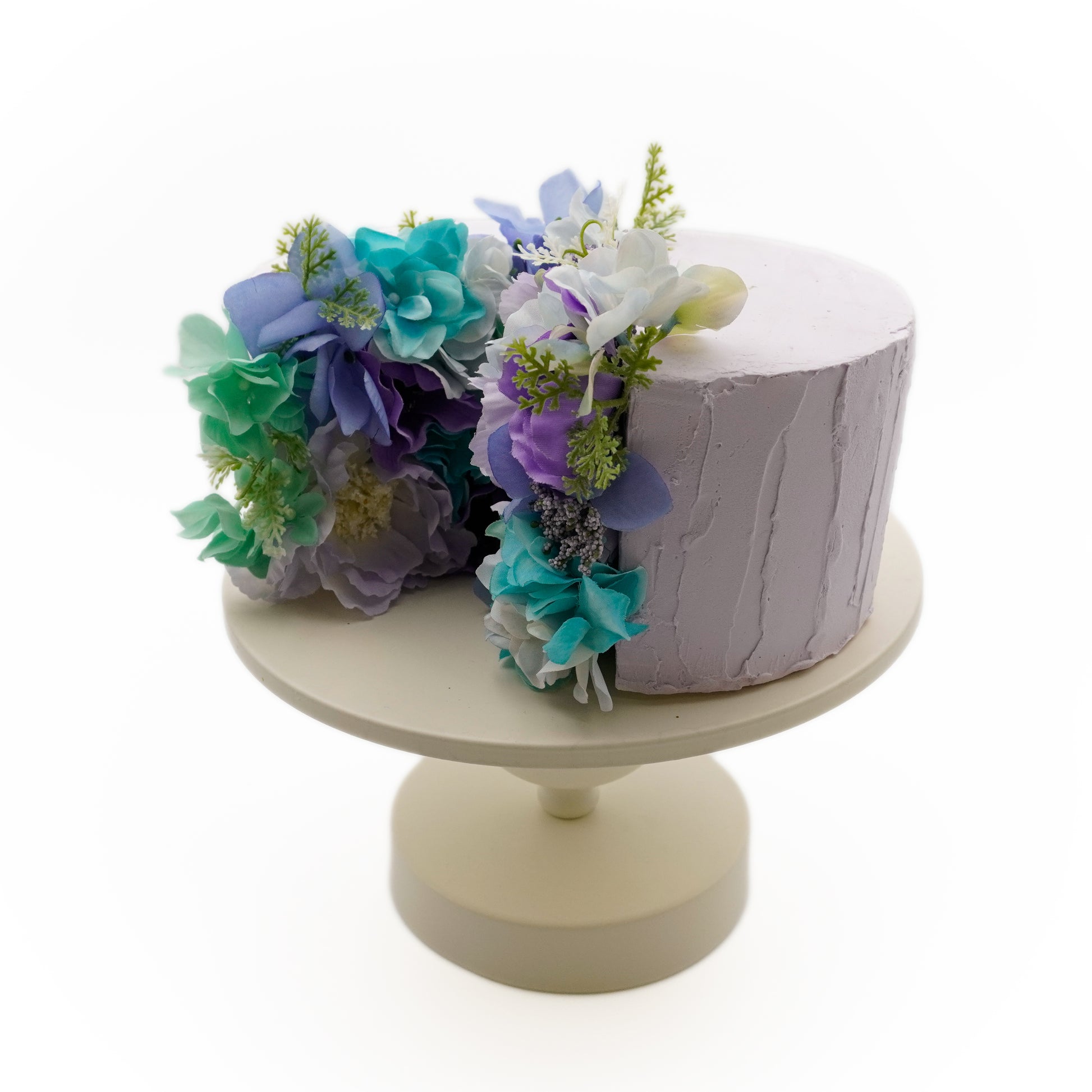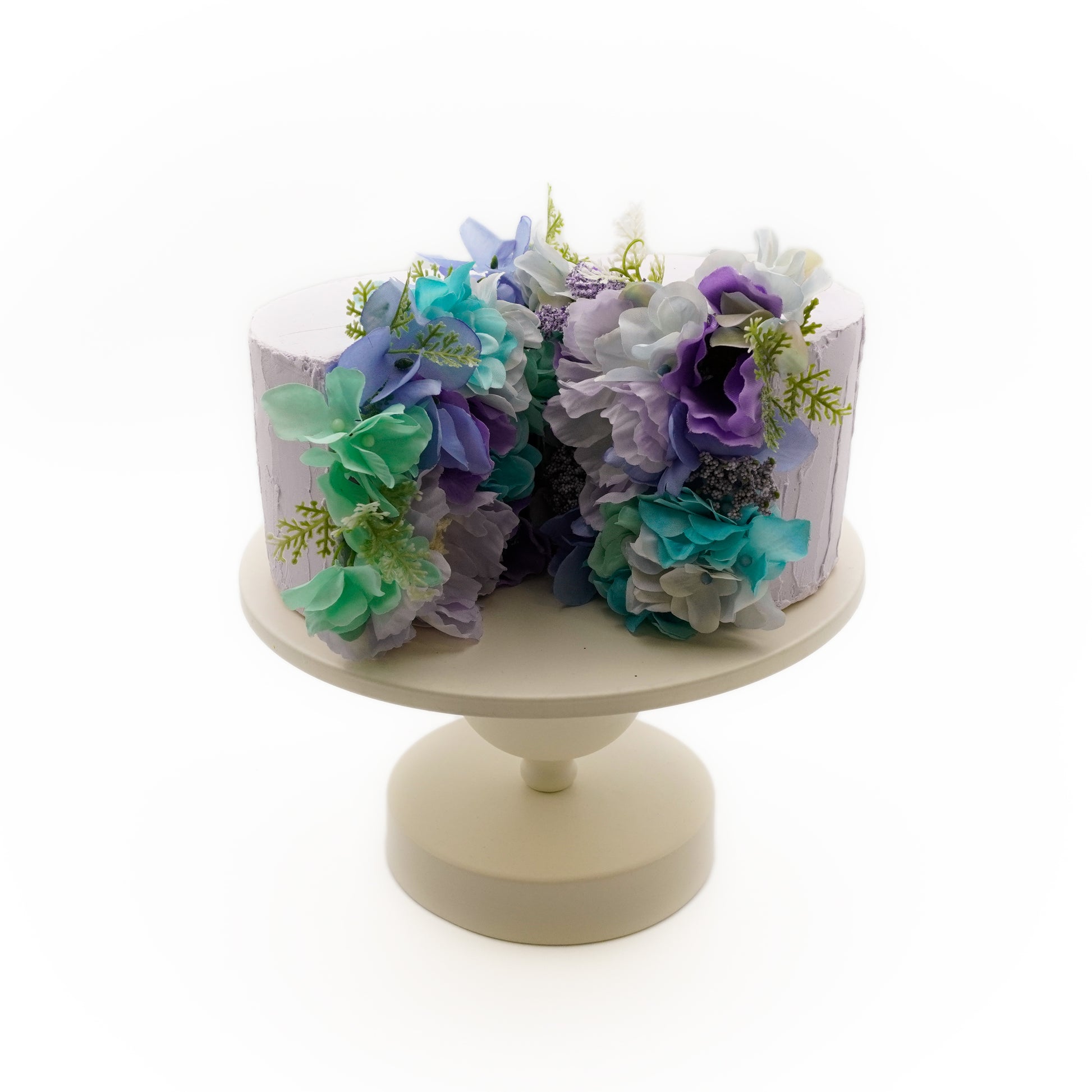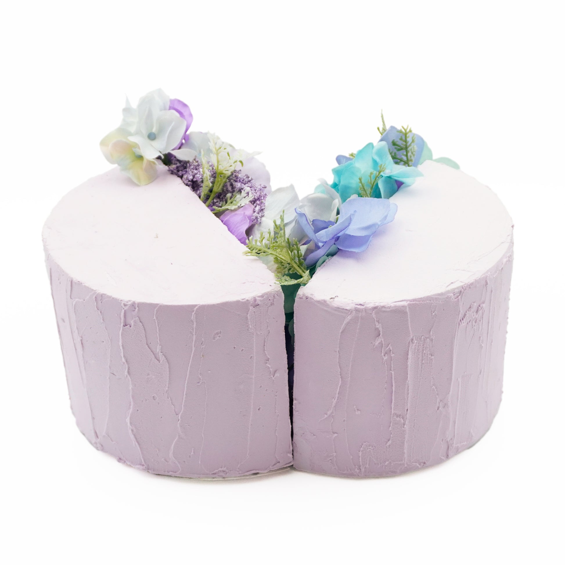 鮮やかな美断面のクレイケーキは、韓国などではトレンドのデザインです。クレイケーキをハーフカットした断面から零れんばかりのムスカリ、アネモネ、紫陽花などが豪奢にケーキをデコレート。ベースのパープルは興奮を抑えたり、感性を刺激し、個性を感じさせる効果や高貴な色として知られています。目を引くデザインはインテリアのアクセントとしても、パーティーのデコレーションとしても、お祝いの品としても、大変喜んで頂けるアイテムです。<注:ケーキ台は付属しません。この商品は食べられません>