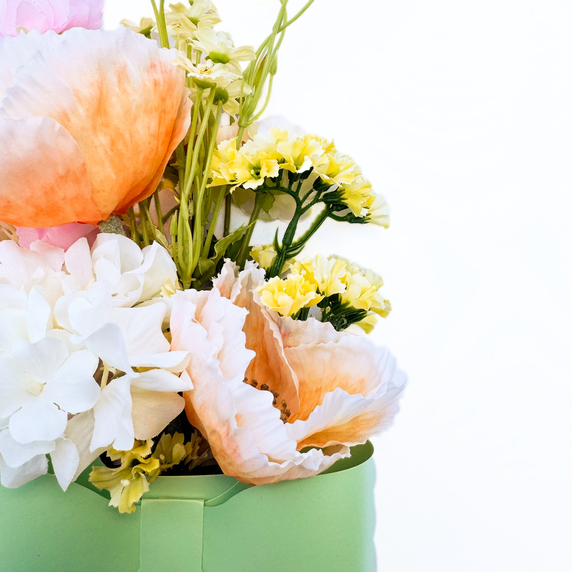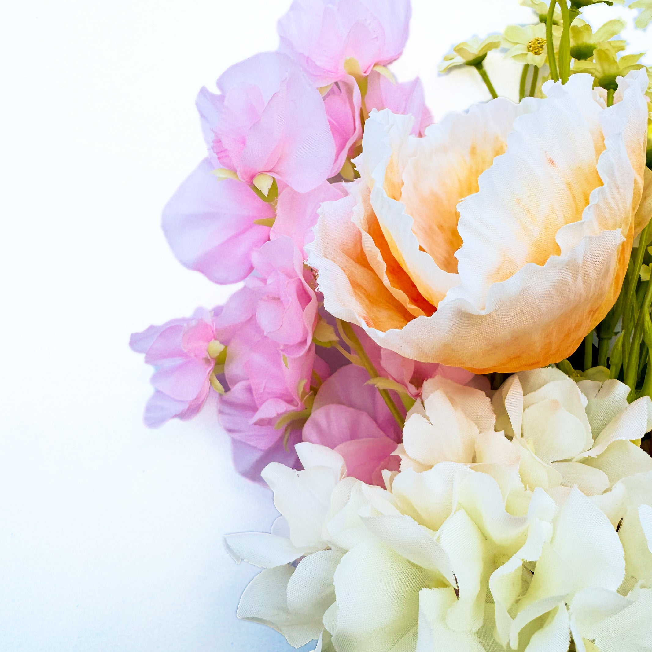 - 花材:ポピー/デイジー/バラ/アジサイ/スイートピー/スターチス等