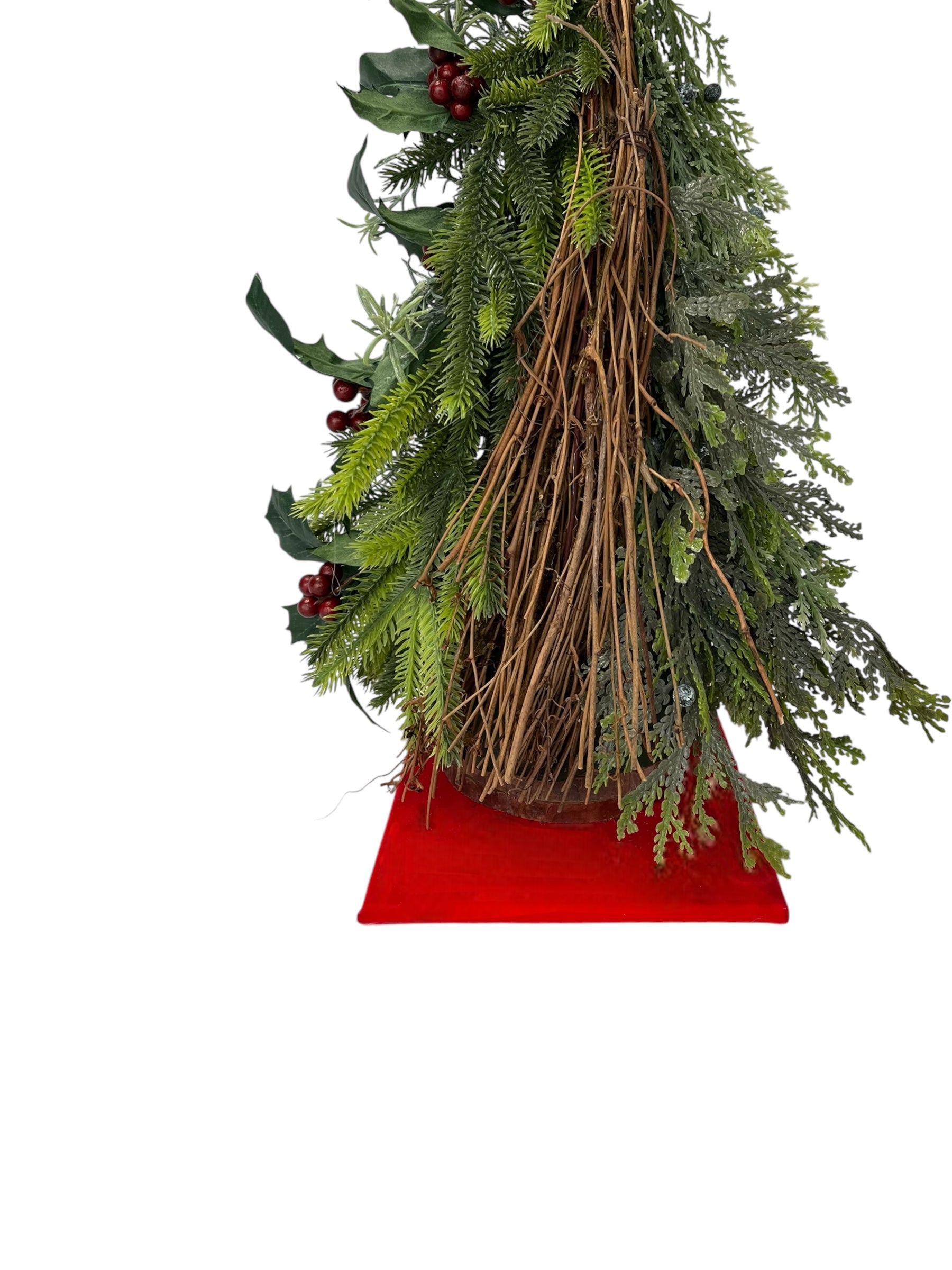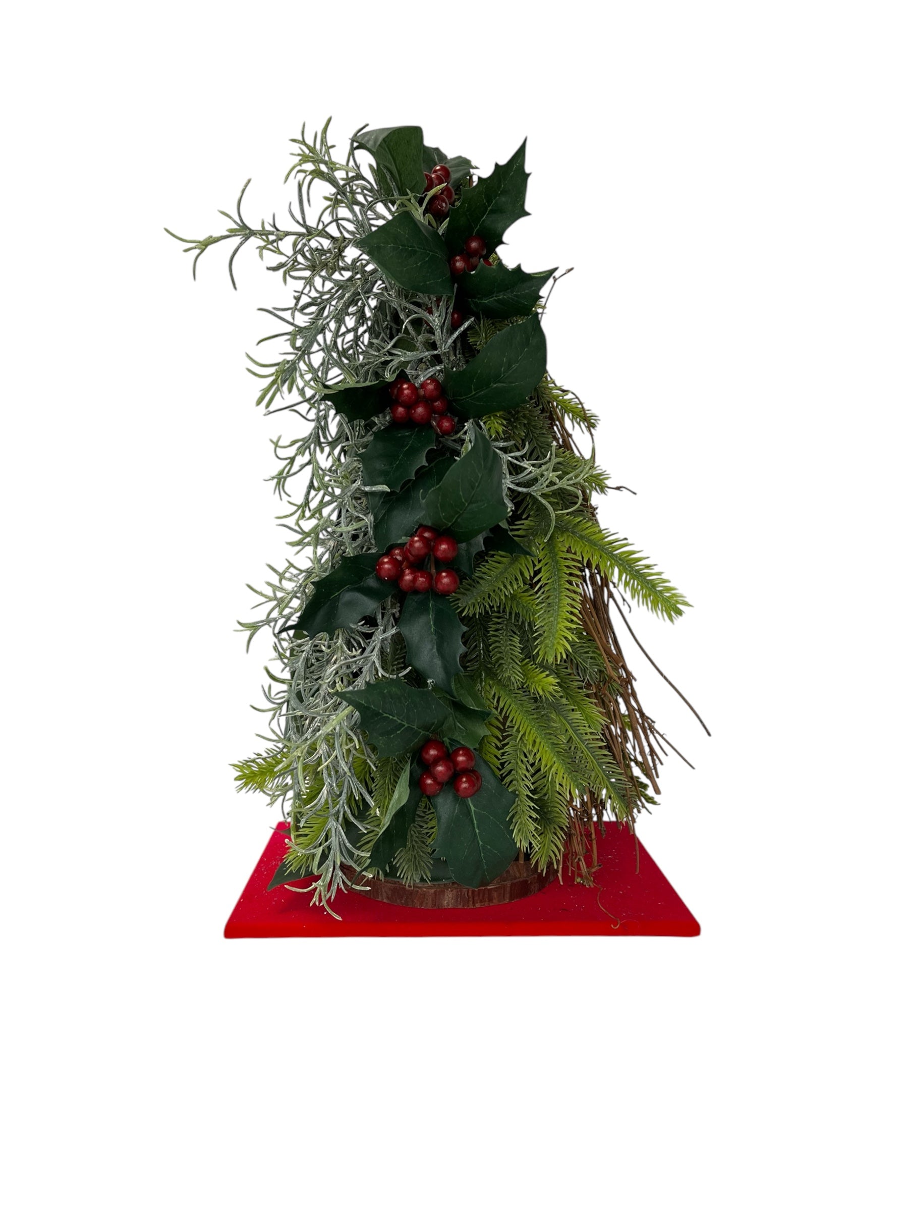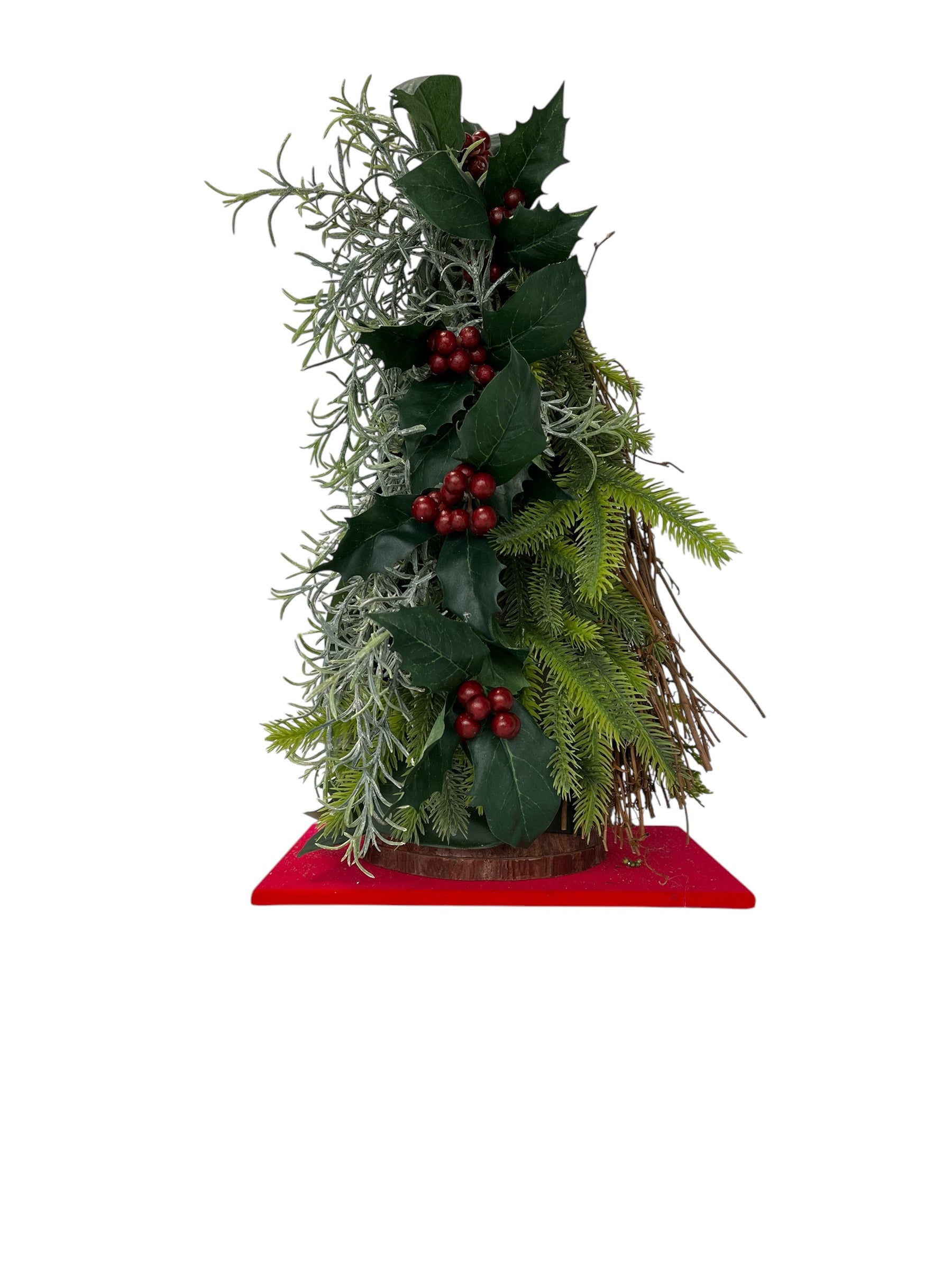 クリスマスシーズンによく使用される、柊やモミノキ・ほうきみたいに束ねた枝・マグノリアの葉などを三角コーン型のツリーになりました。もふもふした暖かな雰囲気でそのまま飾っておくのも良し、お好きなミニオーナメントを飾りオリジナルのツリーに仕上げてみても素敵です。お持ちのクリスマスのお飾りと合わせて並べて飾ってみると一層クリスマスムードが高まることでしょう。<注:ドライフラワーは乾燥しているため、散りやすいものや壊れやすい場合がございます。繊細な商品なため飾る場所や季節等により、ご購入後の色の変化や劣化具合は異なります。>