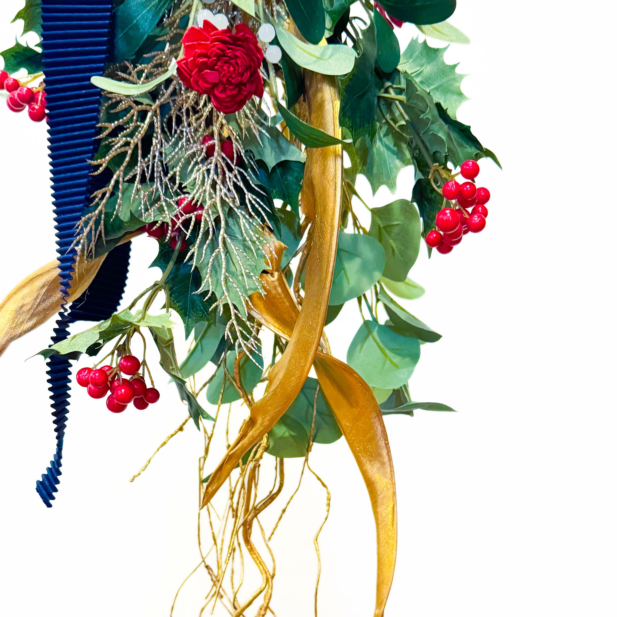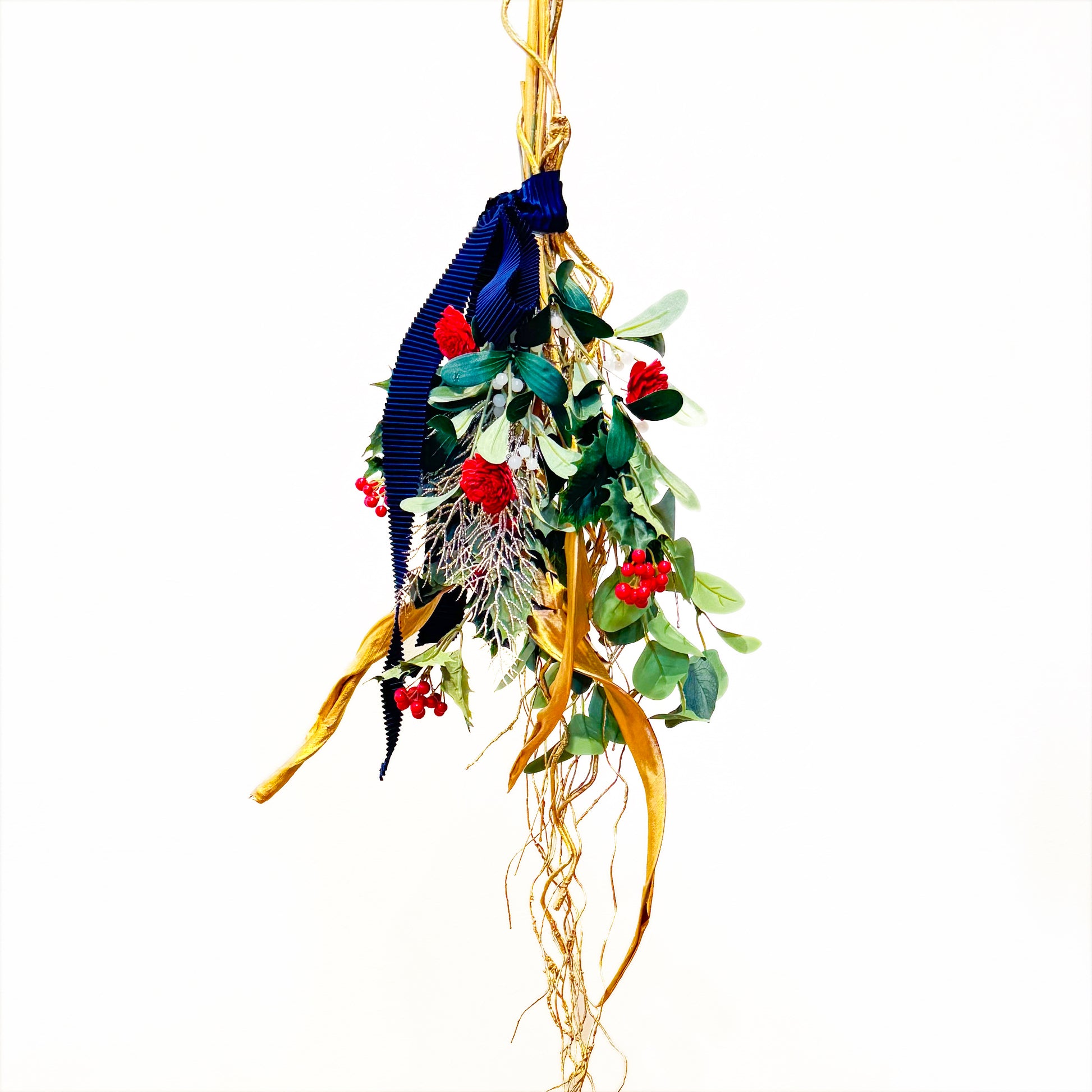 まばゆいゴールドのつた、ストレチアリーフの葉、ユーカリ、「幸運を呼ぶ木、神が宿る木」と考えられていたヤドリギ、「邪気を払う縁起木」ヒイラギとその実、木の皮で造ったソーラーフラワー、レッドフラワーをネイビーのリボンでまとめた華やぎのあるアレンジメントです。