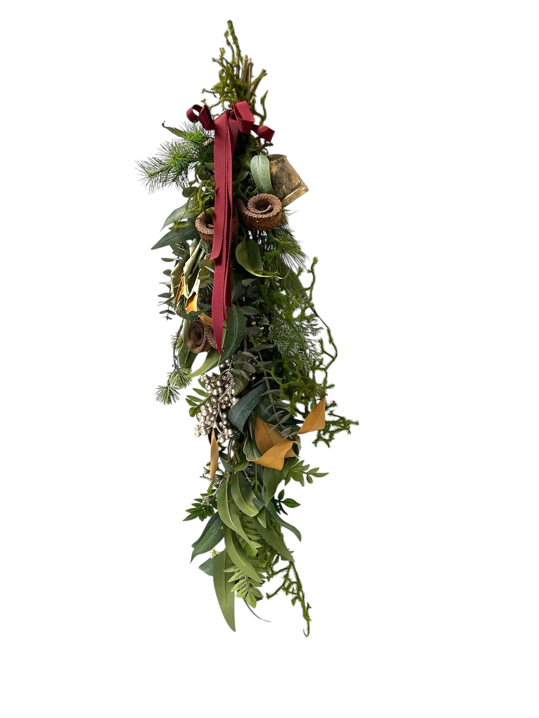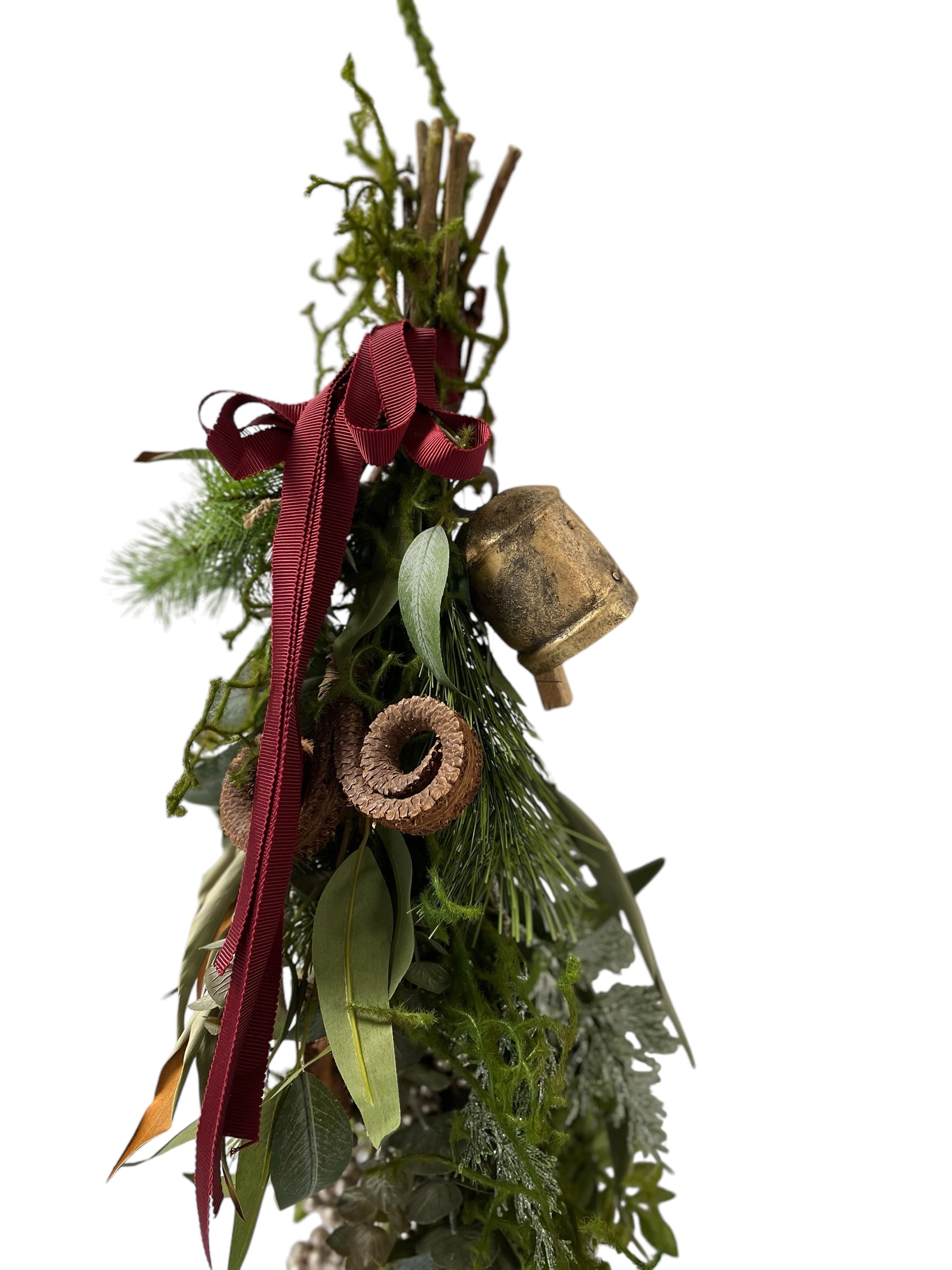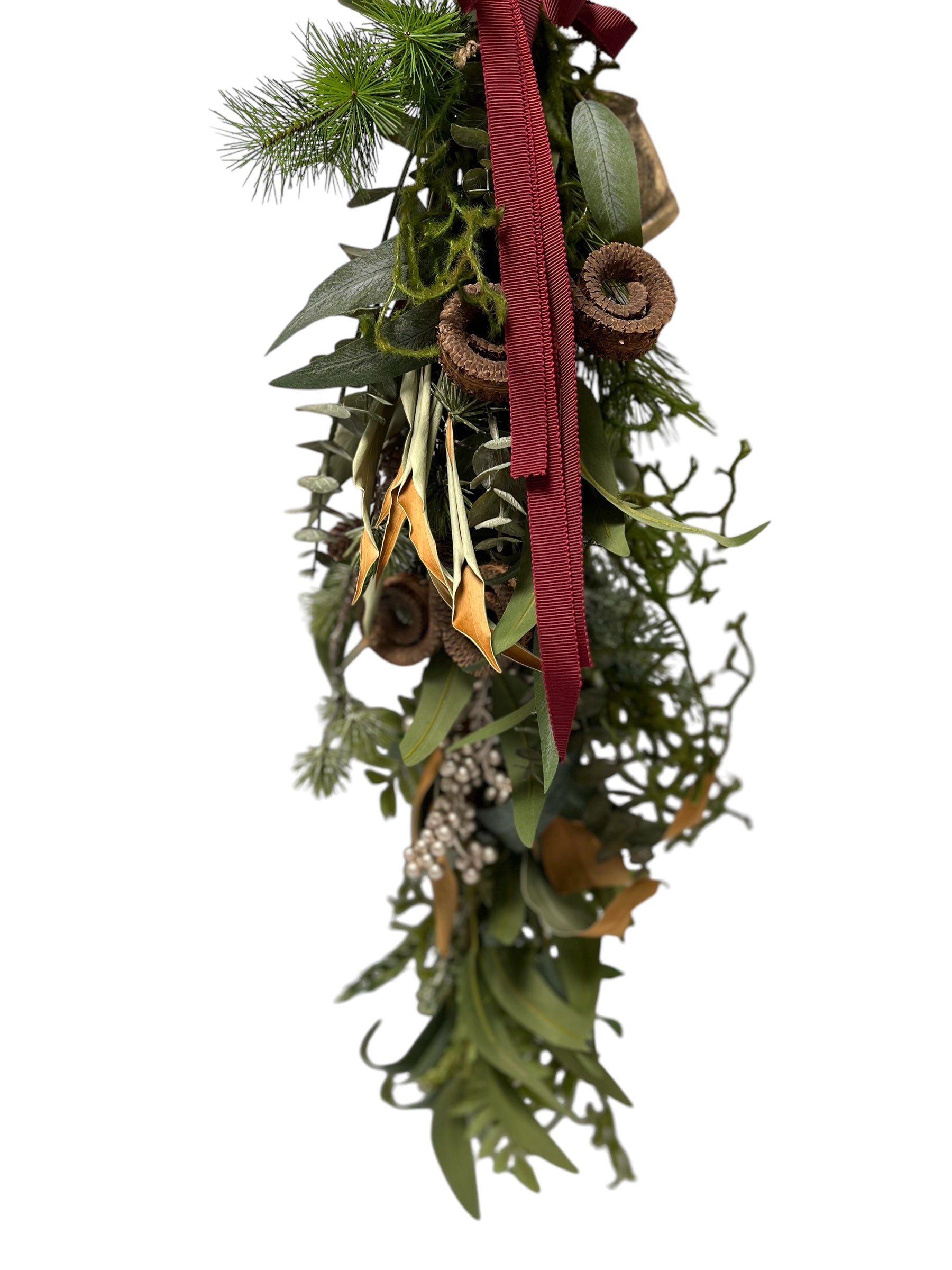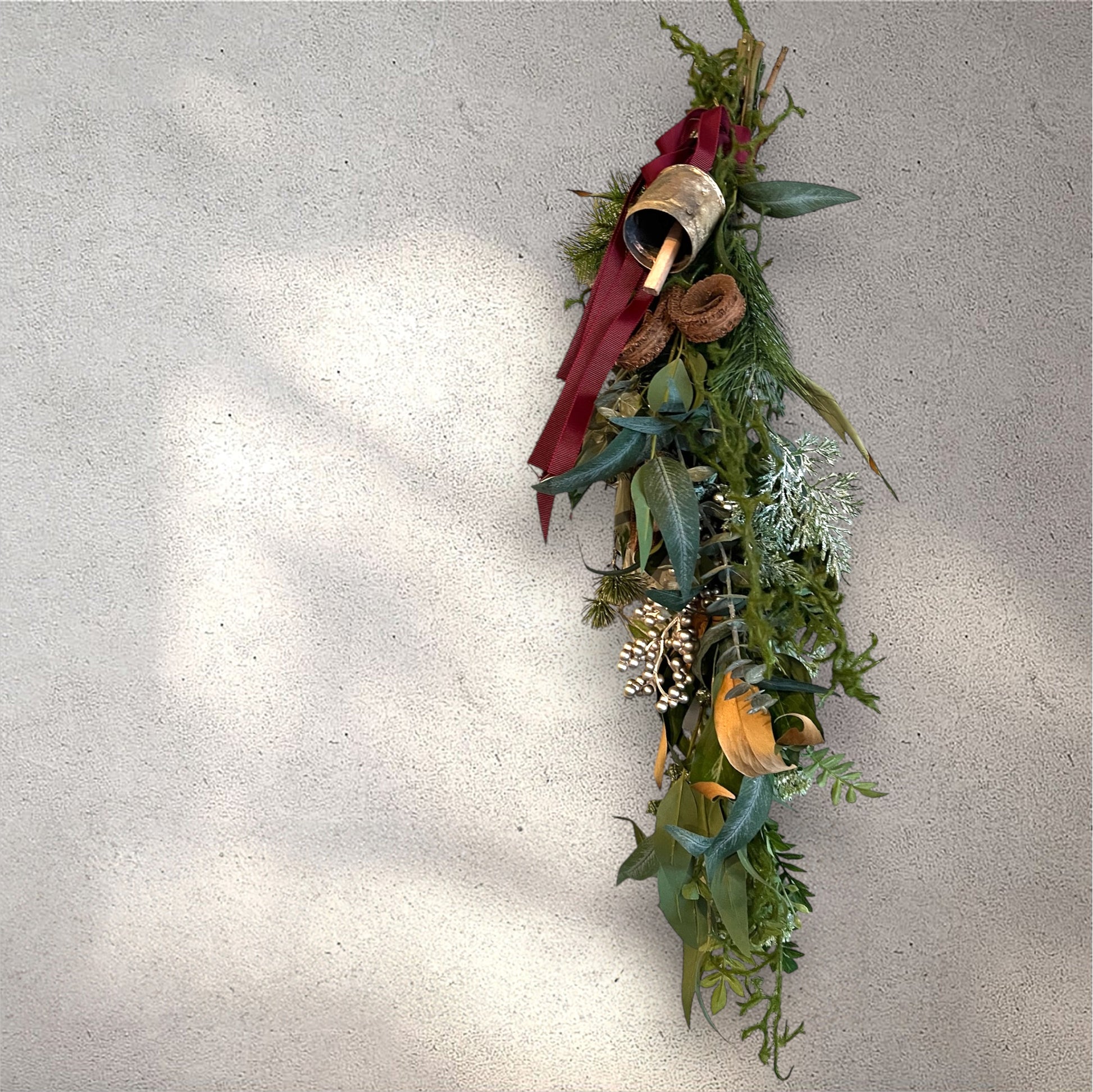 - 花材:ユーカリ・ヒカゲノカヅラ・サイプレス・松・ナナカマド デコレーション:ベル・リボン・シップヘッド