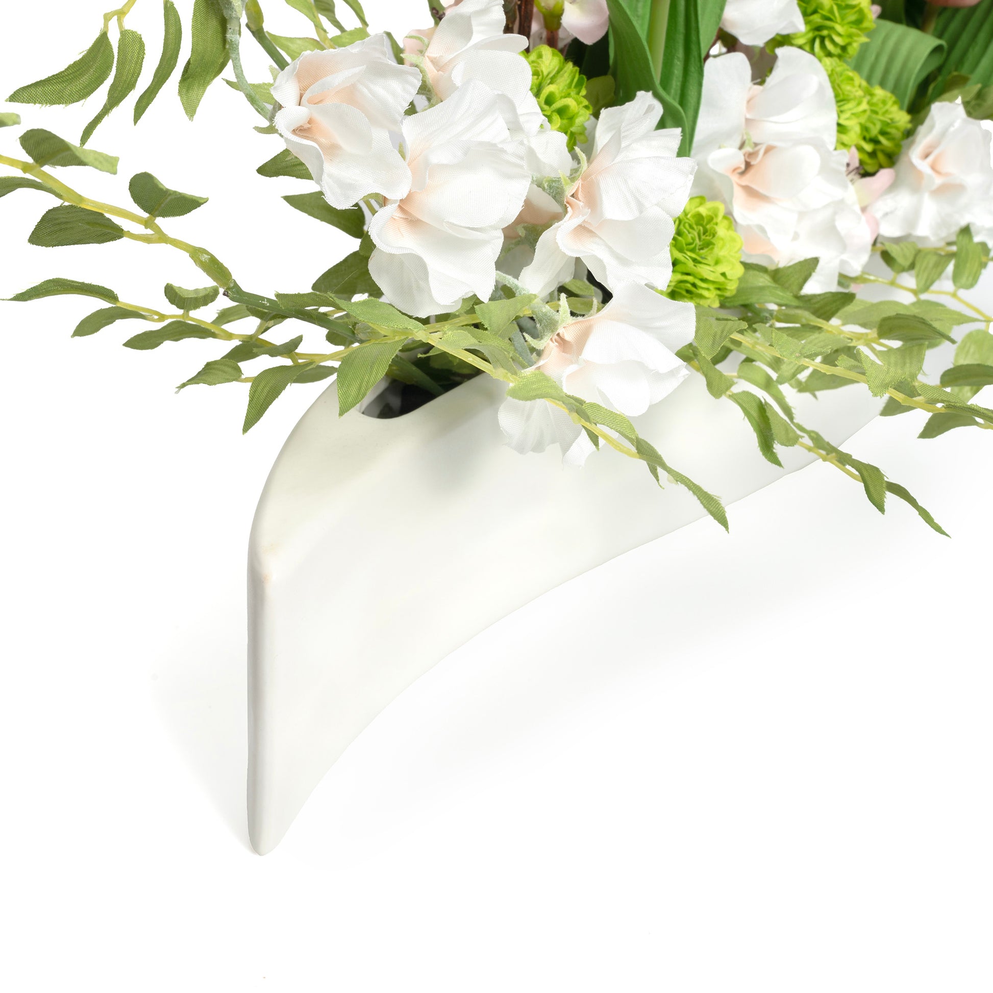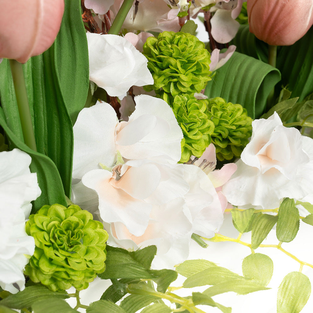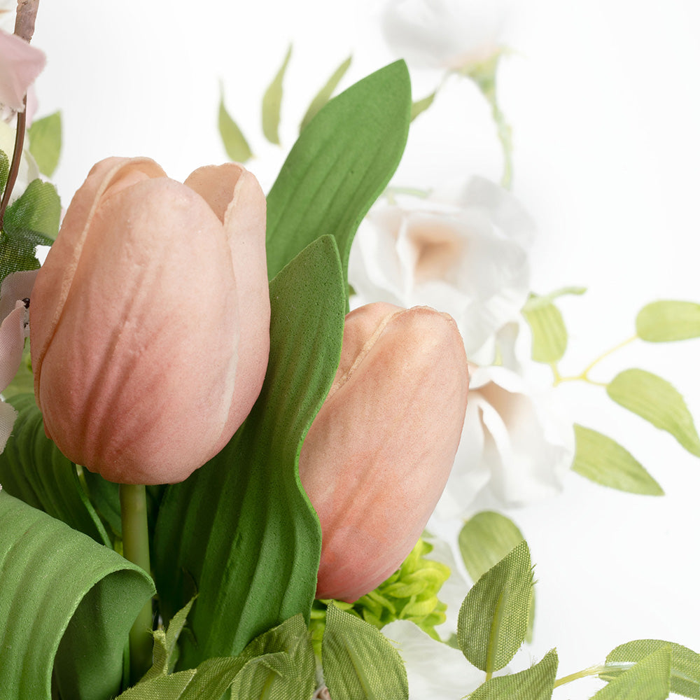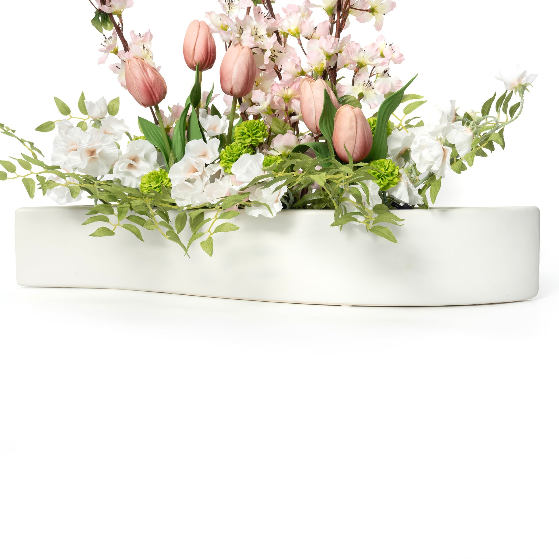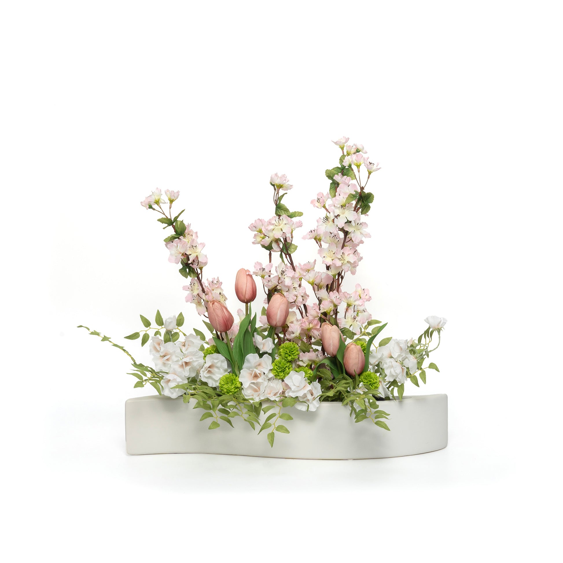 - 花材:スイートピア、桜、マム(菊)、チューリップ、グリーン 資材:陶器の花器