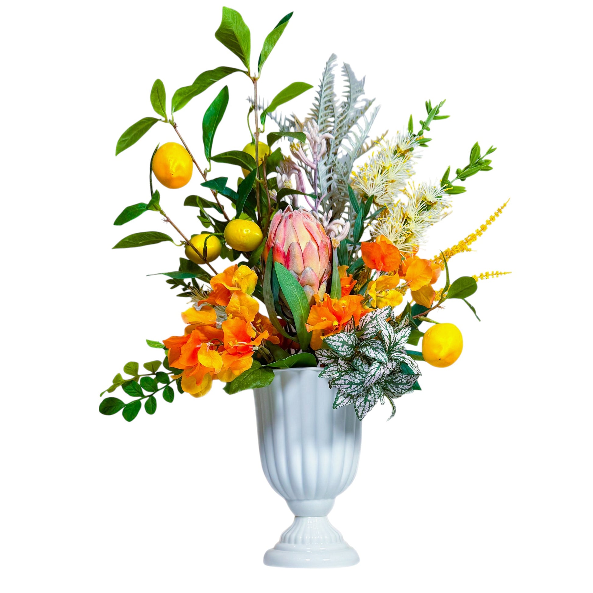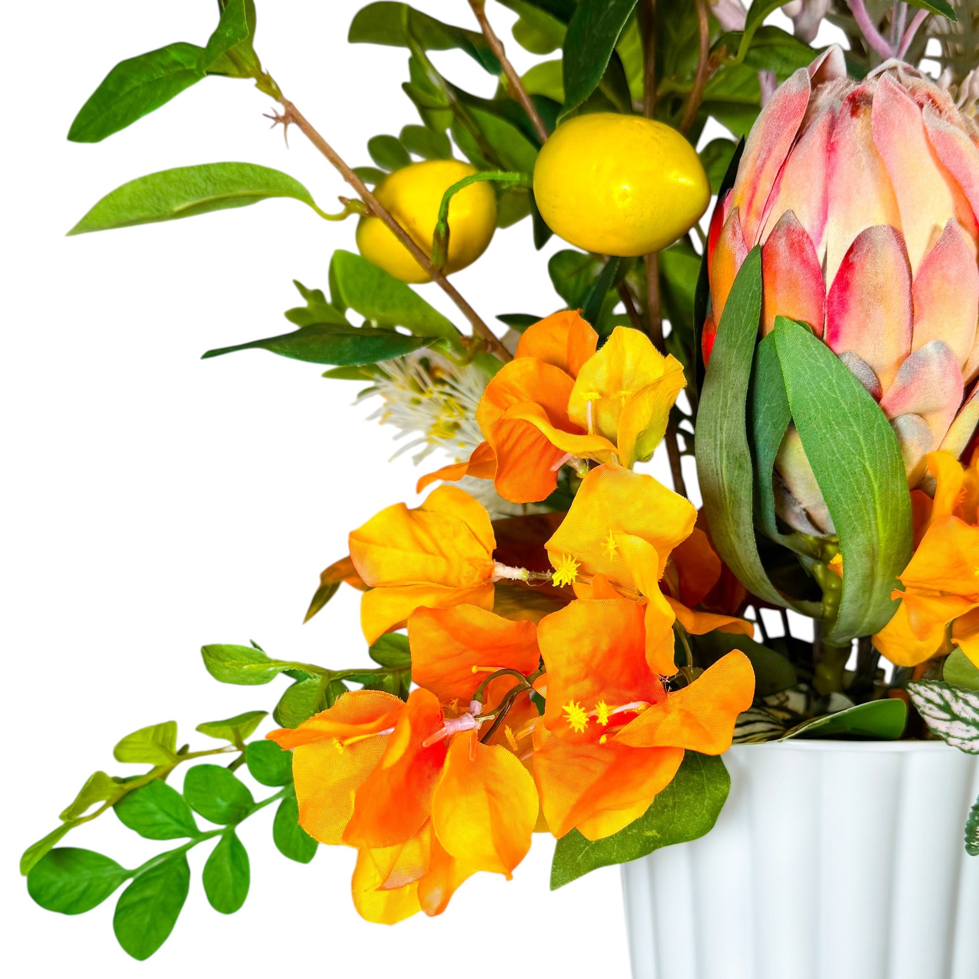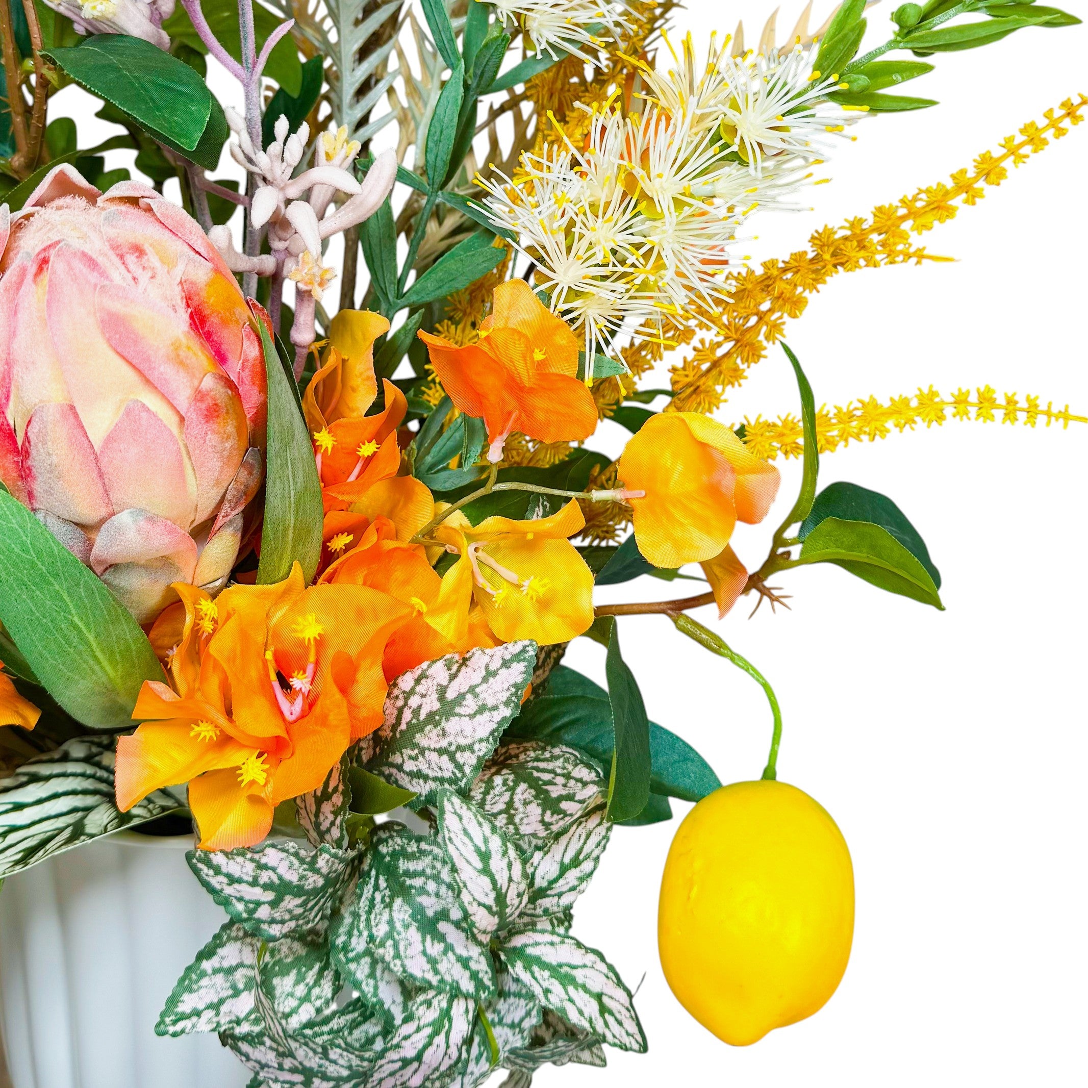- 花材:レモン、ブーゲンビリア、プロテア、ティーツリー、グレビリアの葉、ポルカドットプランツ、カンガルーポー