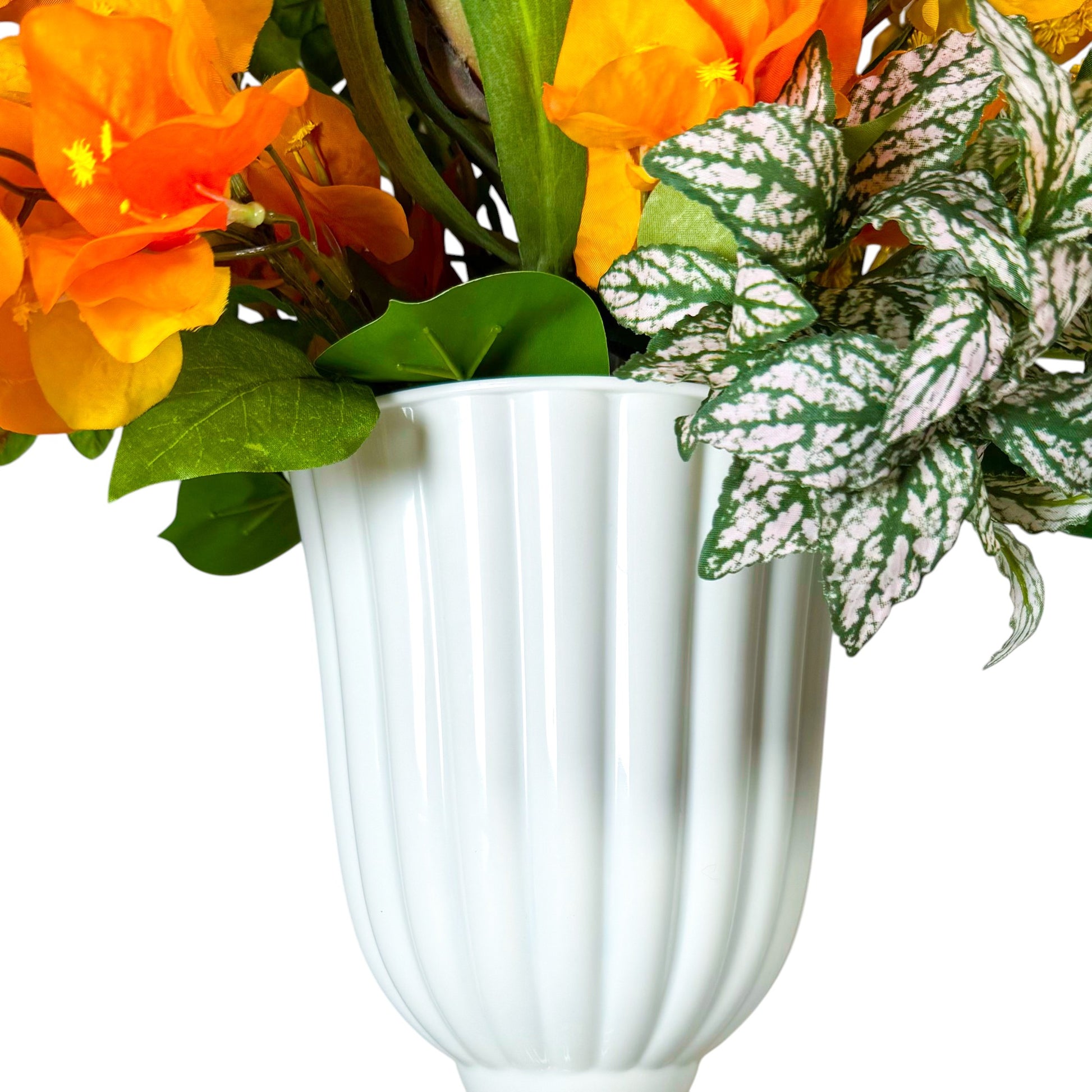 エレガントなホワイトの軽量ポットに収められた、ビタミンカラー好きにはたまらない、鮮やかで華やかなアレンジメント。