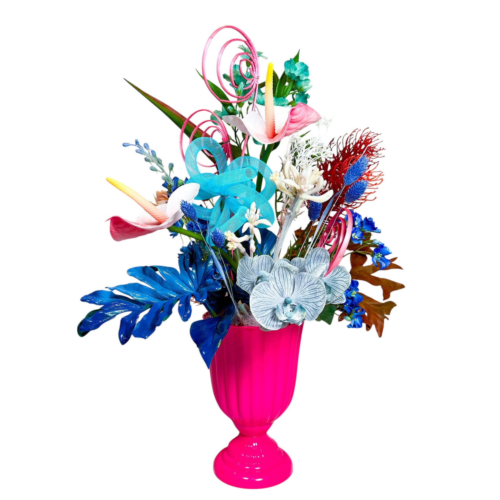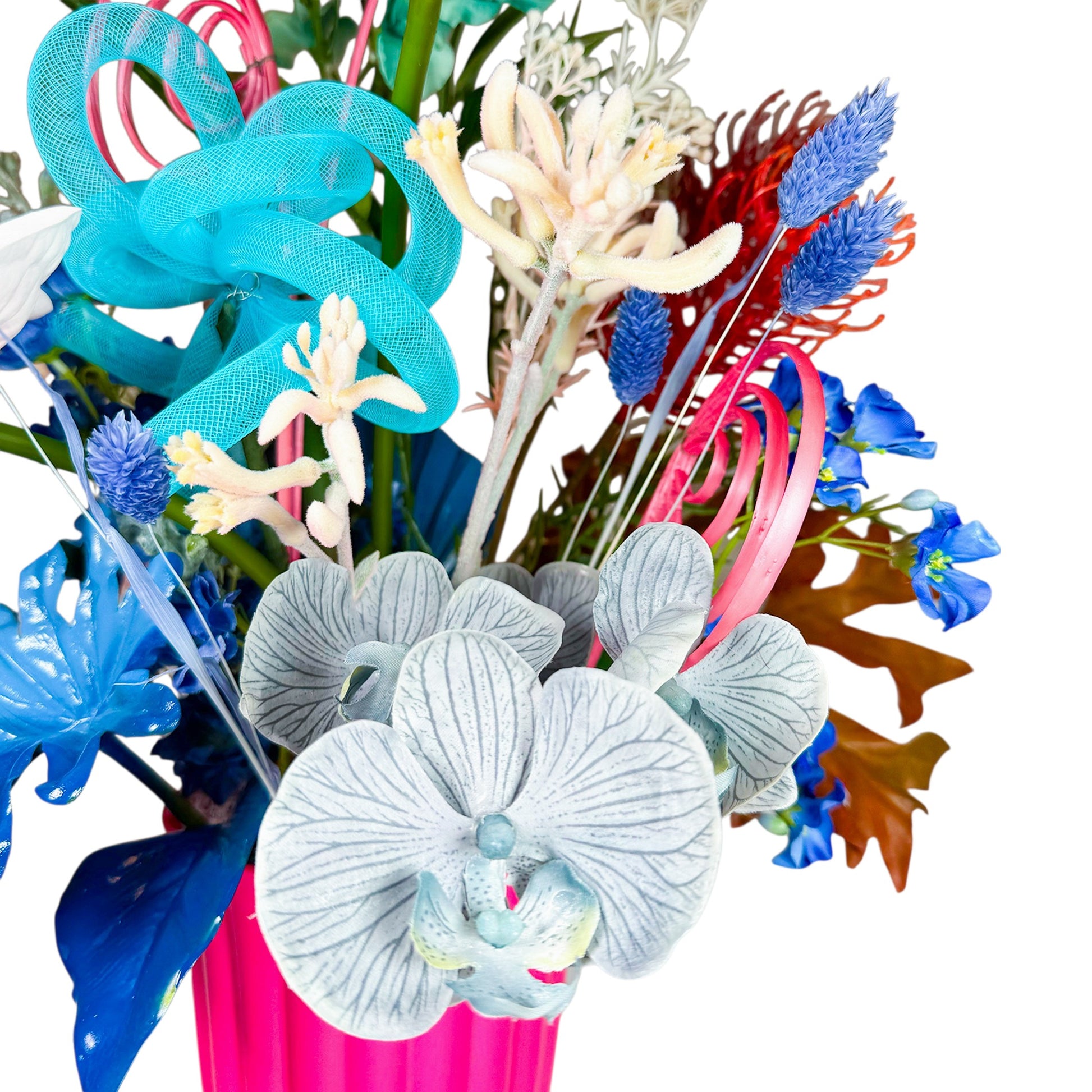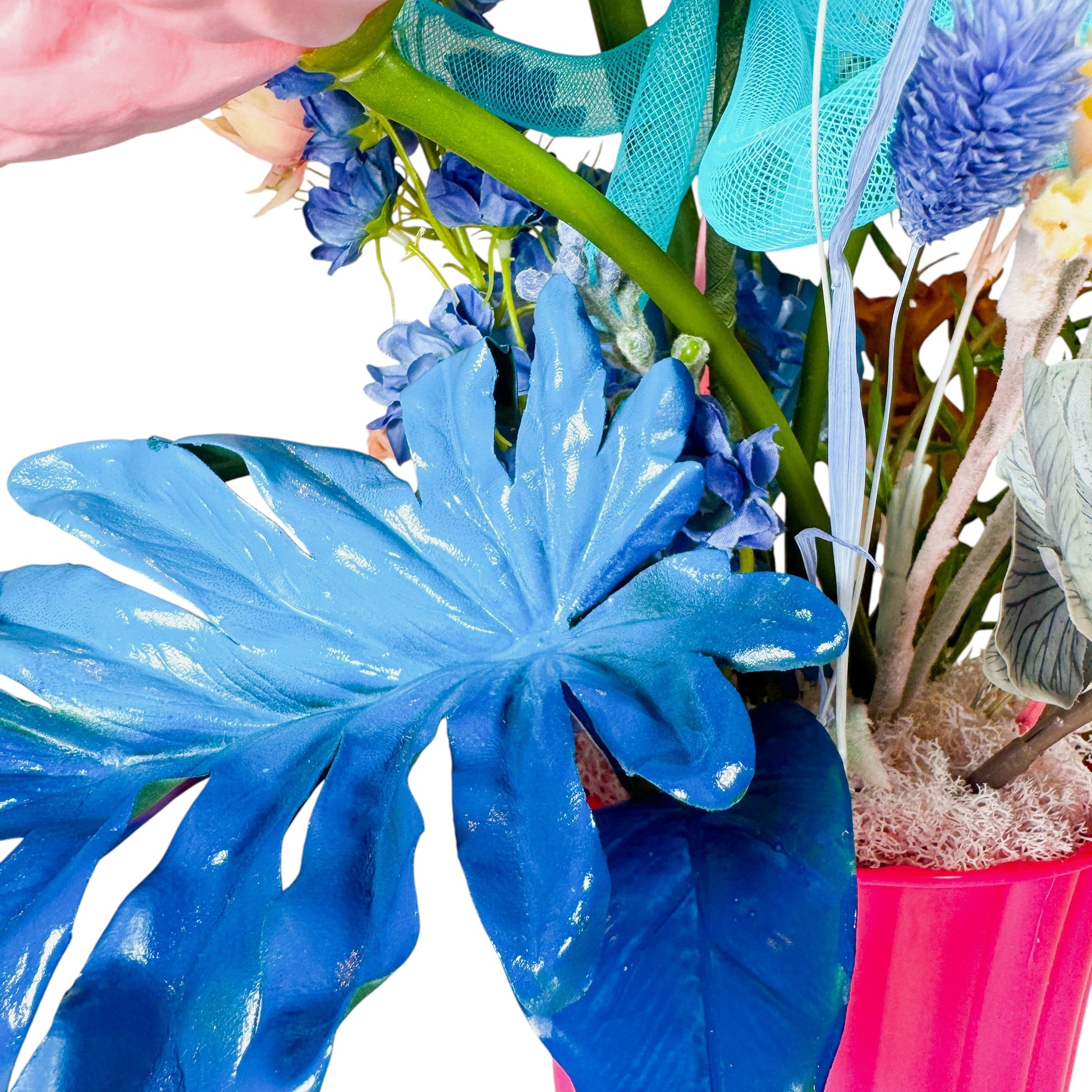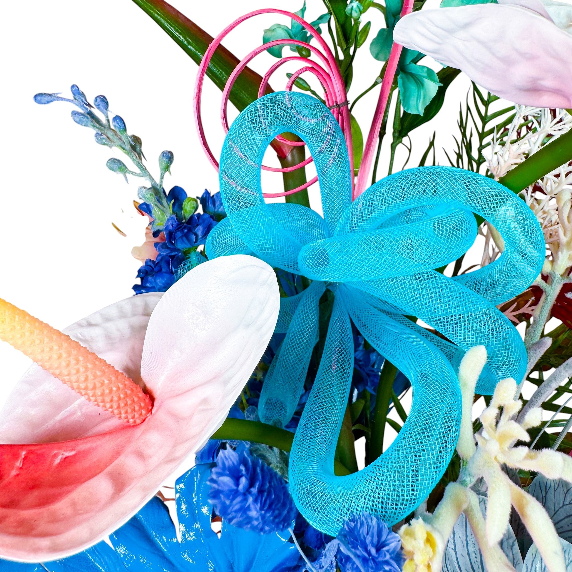 クッカバラのブルーグラデーションや、デルフィニウム、セルリア、アルストロメリアなど、多彩なブルーが知的で爽やかな印象を演出。ブルーのヤシの葉が空間に動きを加え、ネット状のスカイブルーのリボンがポップな遊び心を添えています。さらに、デニムブルーの蘭が全体を引き締め、クールで洗練されたアクセントに。フラミンゴカラーのアンスリウムや、ピンクの竹製のオブジェ、カンガルーポーが個性と遊び心をプラスしつつも、全体はスタイリッシュにまとまっています。置くだけで空間のおしゃれ度UPする、明るく印象的なアレンジ。お祝いのギフトや、センスあるインテリアアイテムとしてもおすすめです。<※付属品:ポット*カラーはお選び頂けません。商品画像をご参照ください>