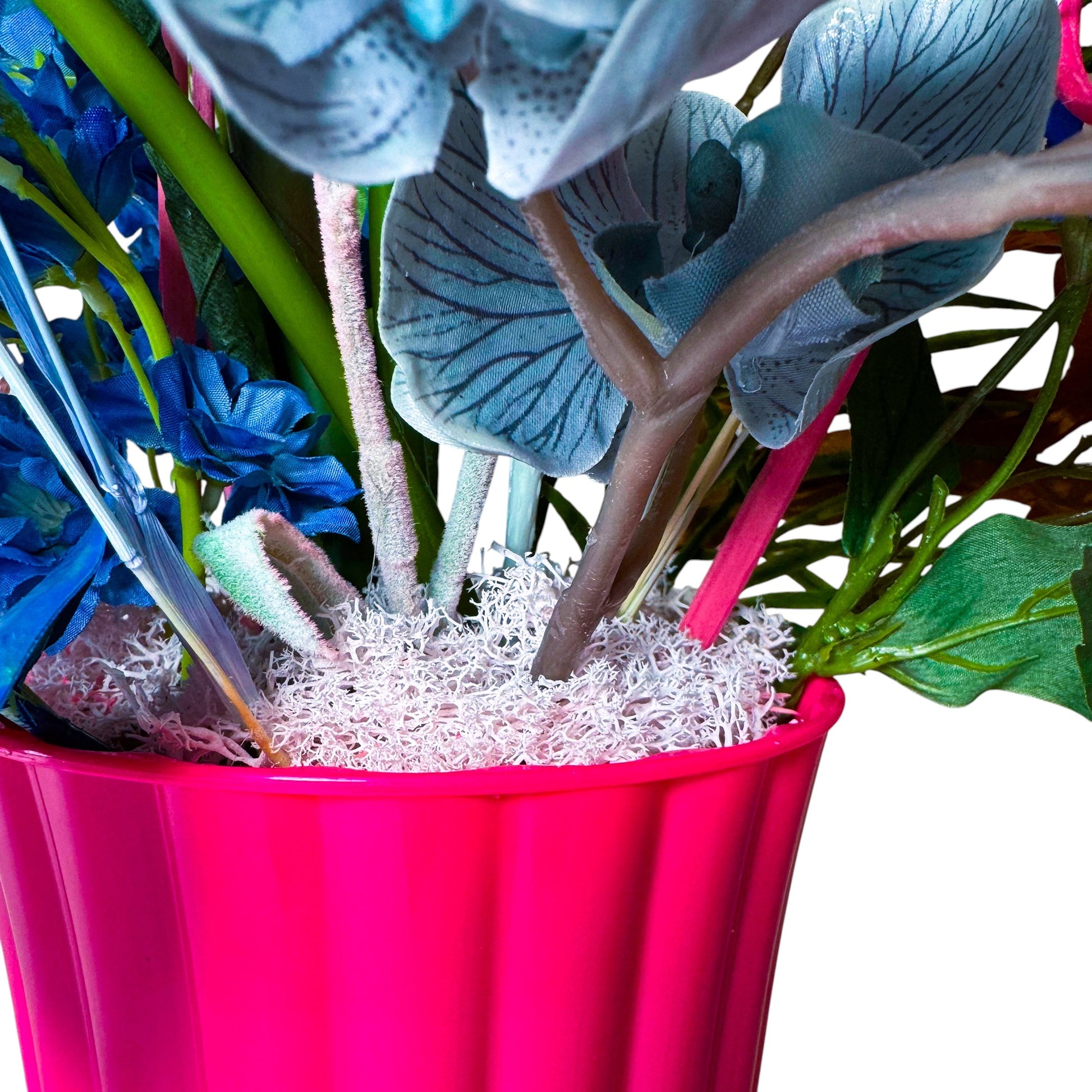 心弾むビビッドな軽量ポットに彩られた華やかでおしゃれなオブジェ。ピンク好きに嬉しい鮮やかな色合いと、ピンクモスの統一感が魅力です。