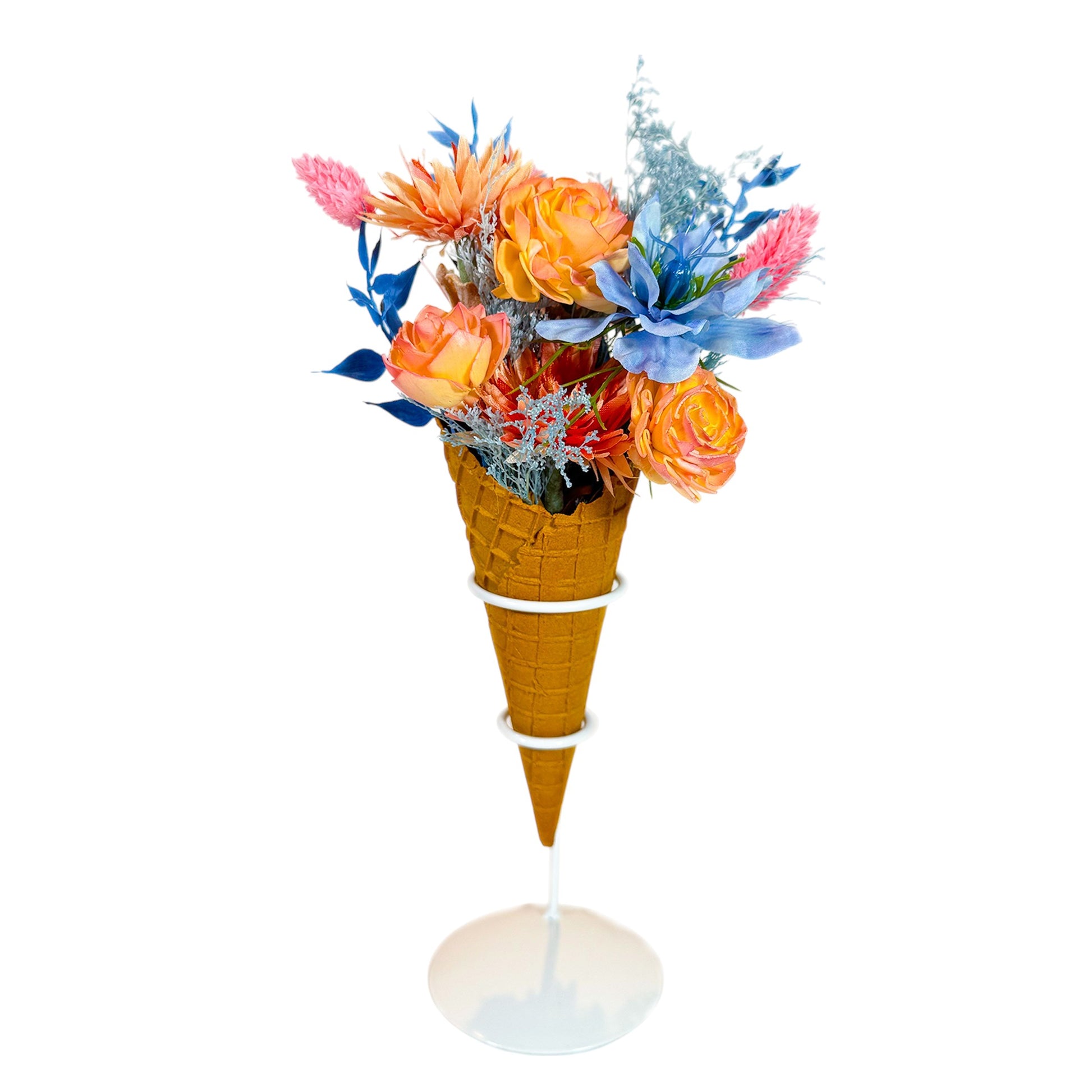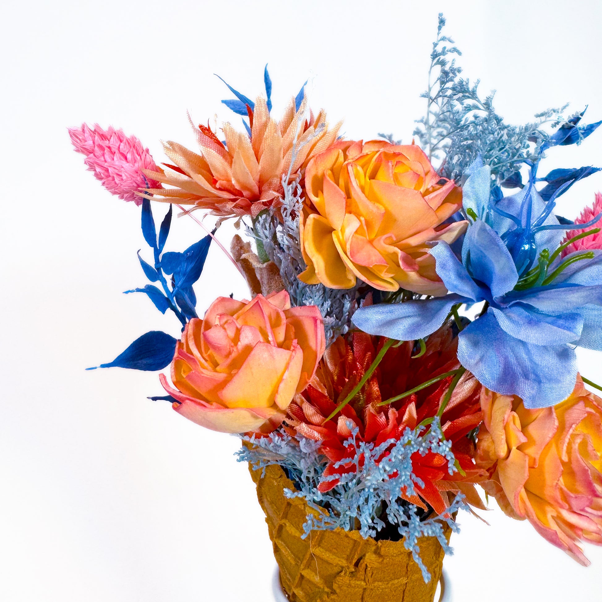 まるでアイスクリームのような可愛らしさ。ワッフルコーンに入ったアーティフィシャルフラワーのブーケは、見た目のインパクトも抜群。付属のカップホルダーを使えば、玄関やカウンター、デスクの上などにそのまま飾れます。ブーケ部分だけを取り外して、お気に入りの花器に移すことも可能。渡しやすく飾りやすい、自由にアレンジできるおしゃれなアイテムです。