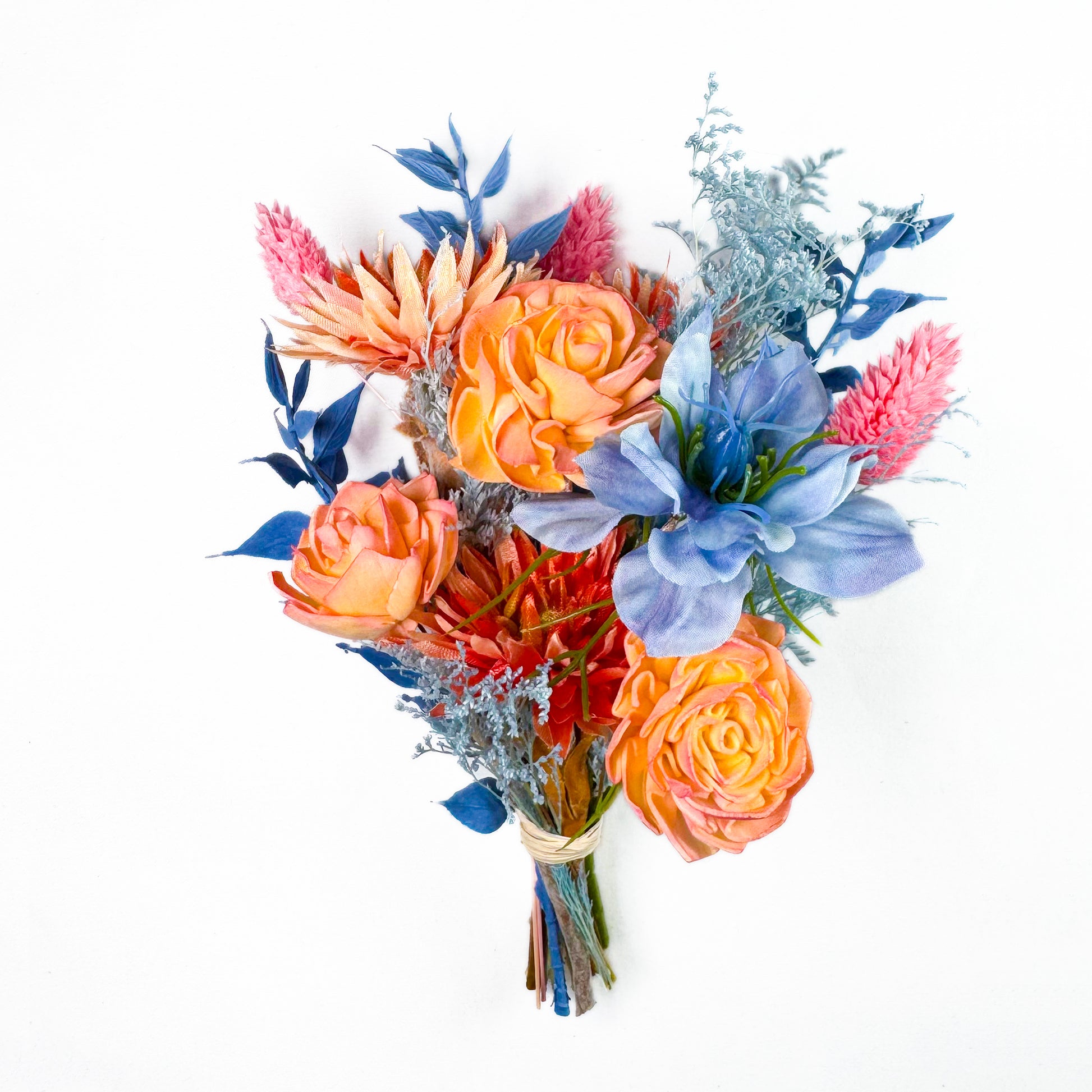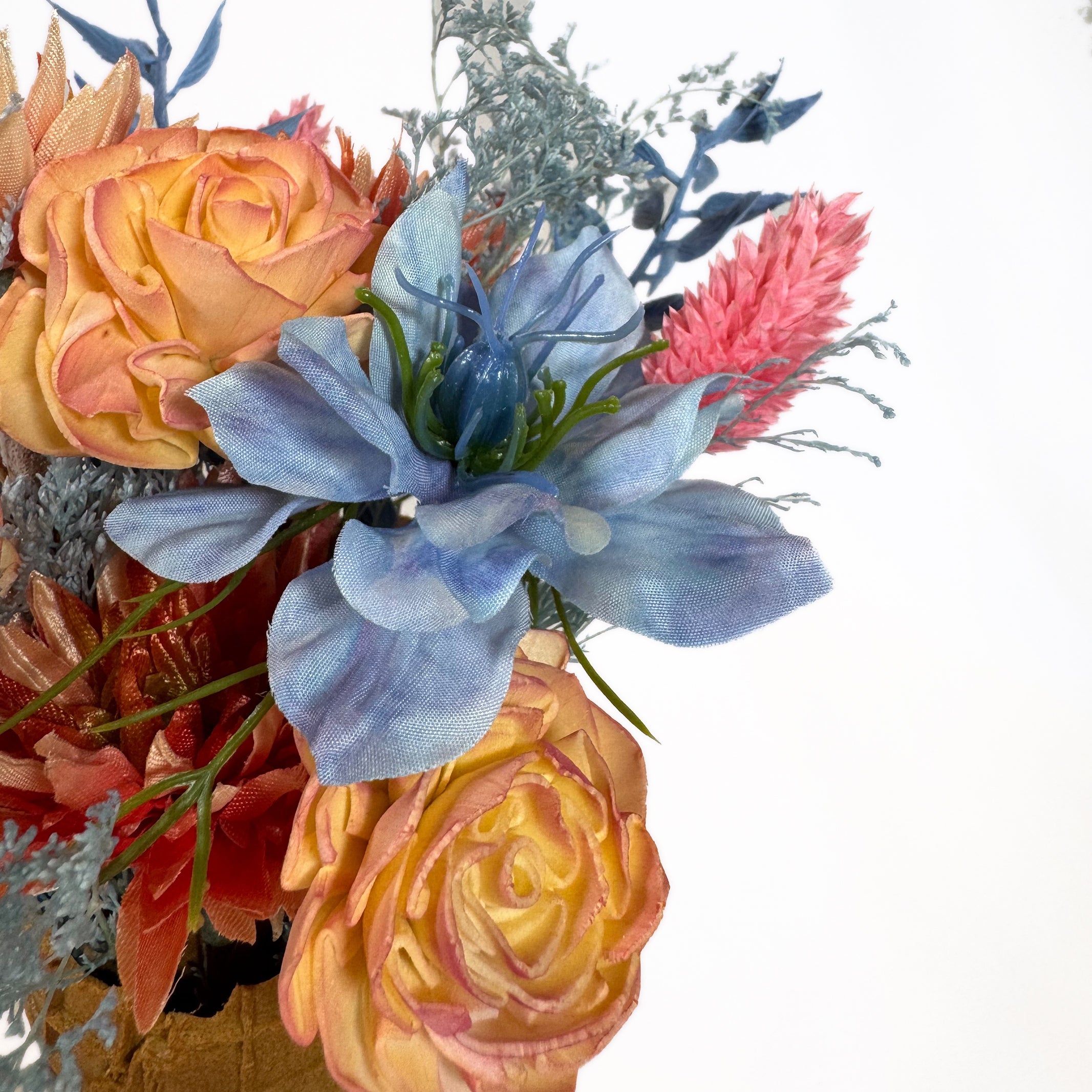 ビビッドなピンクが映えるポアプランツ、南アフリカ原産で短期間しか咲かない貴重な花・エバーラスティング、「星に願いを」という花言葉をもつ涼しげブルーのアストランティア、グラデーションが華やかなソーラーダリア等をシックにまとめたブーケ。華やかでありながら落ち着きも感じさせ、お部屋のアクセントにもギフトにも最適です。<注:本商品は食べられません。ドライフラワーは折れやすいので、取り扱いにはご注意ください><※付属品:カップホルダー(ブーケは取り外し可能)>