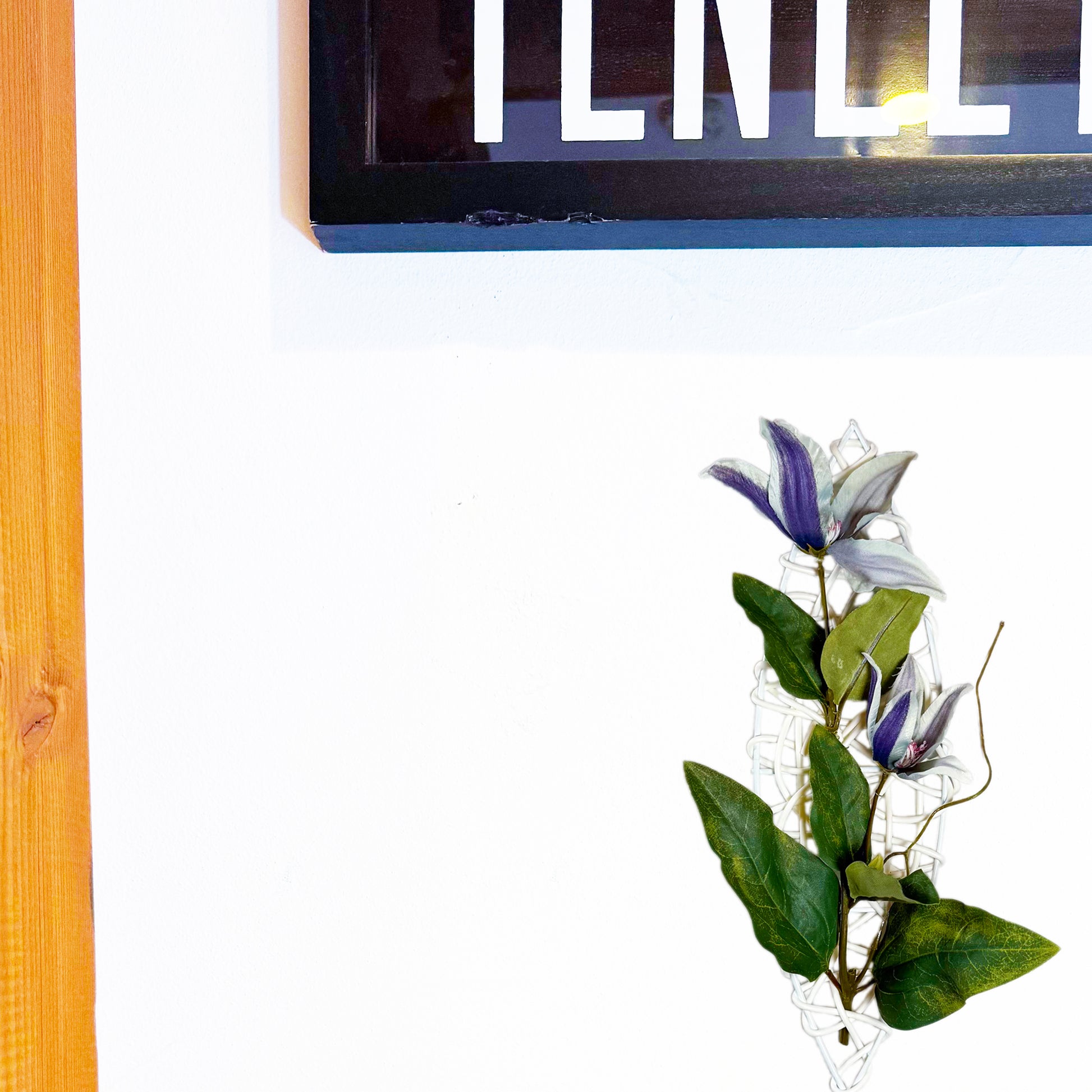 なかでも、クレマチスを基調としたアレンジは、スタイルを問わず、かけるだけで空間をシックに引き締める万能アイテム。ワイヤーにホワイトチューブを絡めたベースは、押しピンで簡単に設置でき、見た目も軽やかでモダンなアクセントになります。