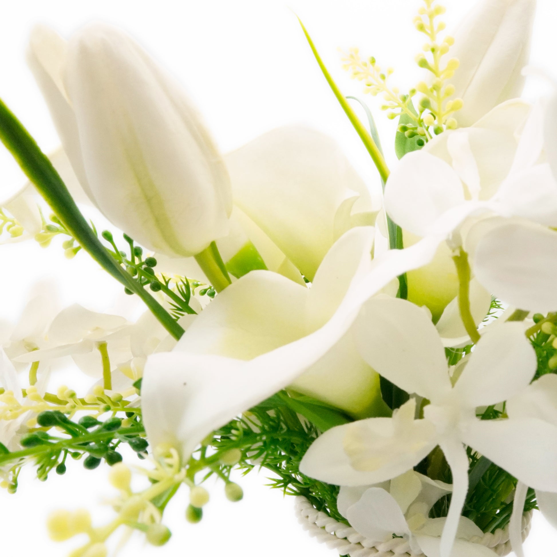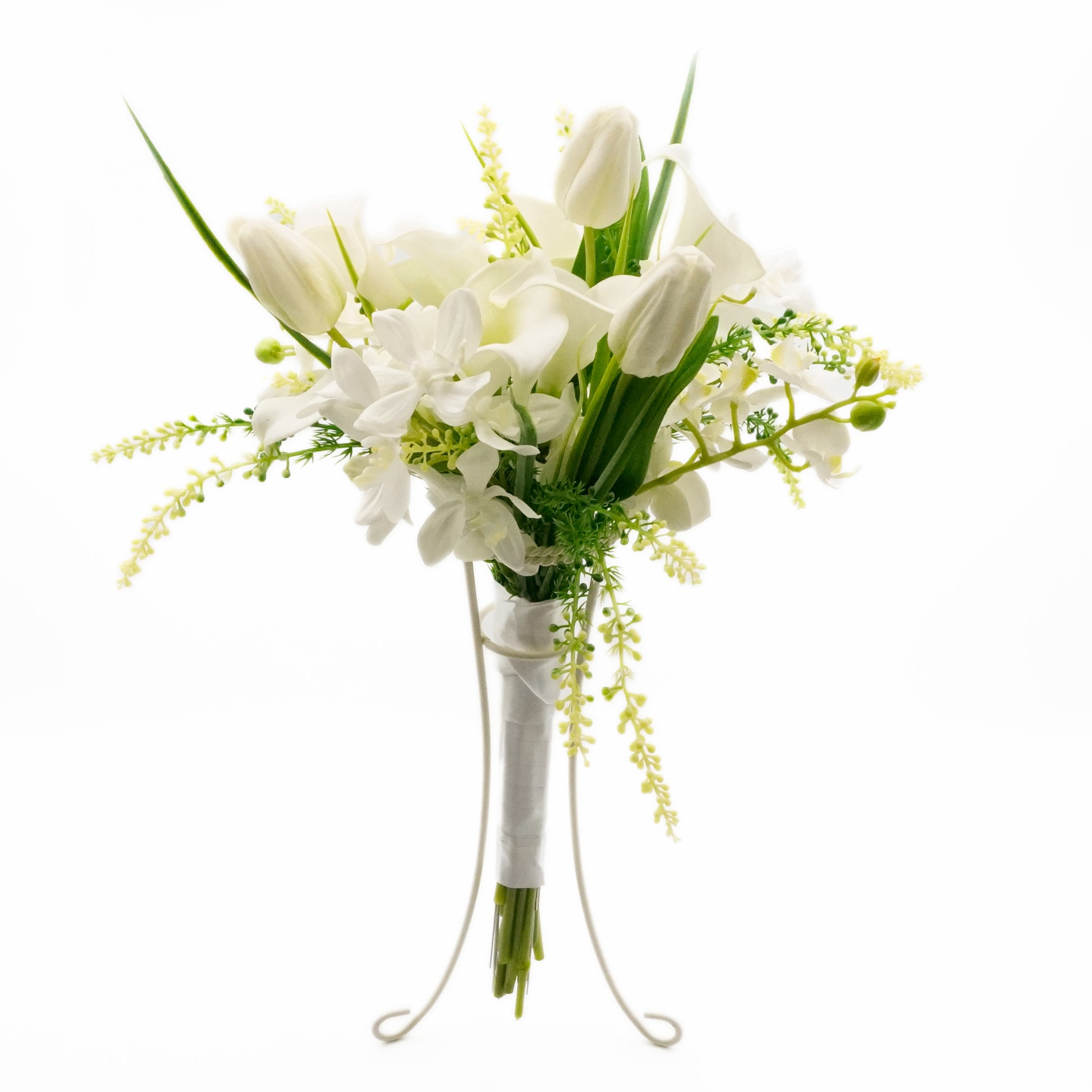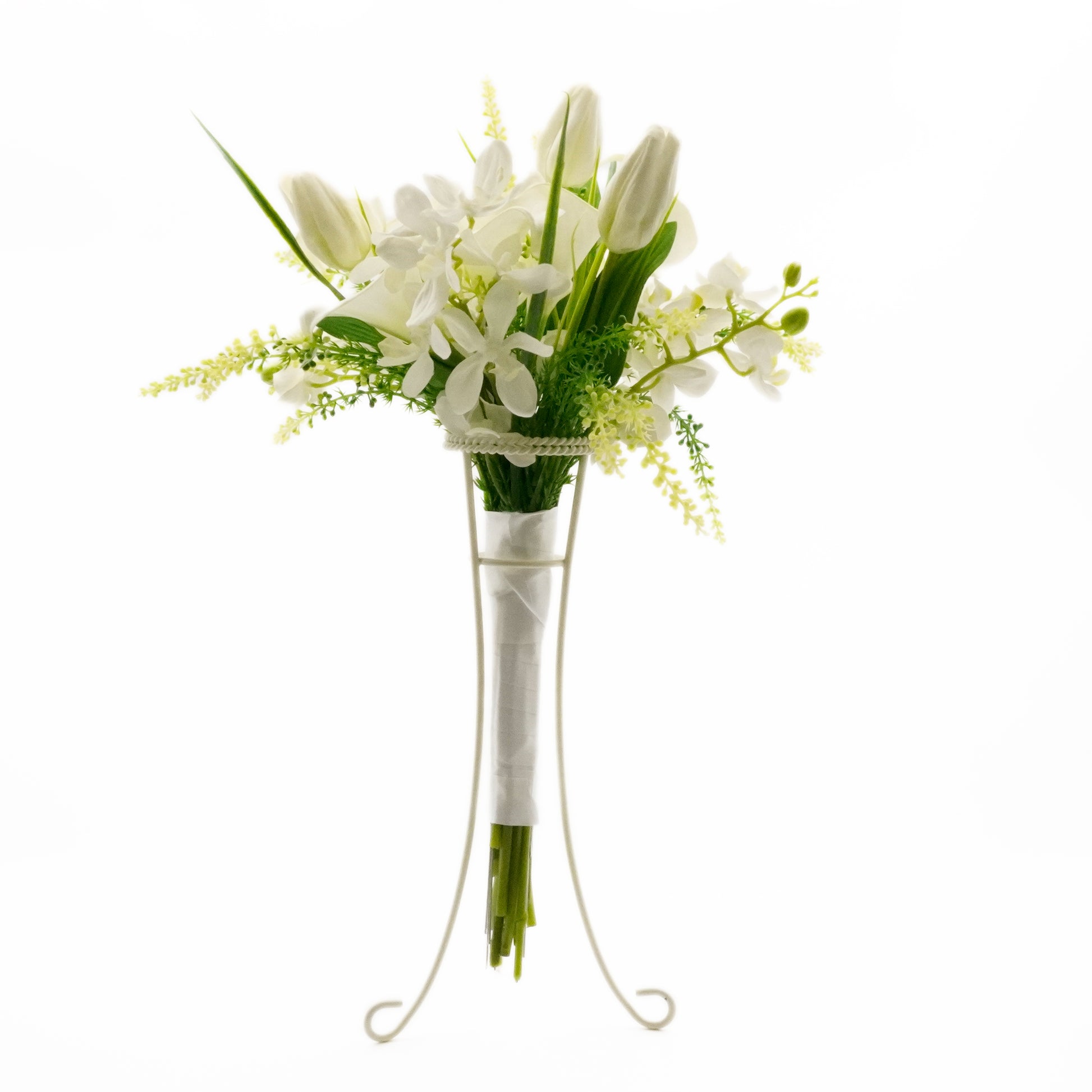 ブーケと言えば、ウェディング。ホワイトカラーとグリーンが散りばめられたこのブーケはとても品よく纏まったデザインです。特に純真無垢なホワイトカラーは花言葉が「清浄」「華麗なる美」と、その外観どおりのお花です。またお祝いのシーンでは欠かせない「思いやり」「有能」などの花言葉をもつ胡蝶蘭(レンファレ)や愛らしいチューリップが花束の完成度を高めています。手元には白いサテン調のリボンが巻かれているので、ブーケとして持ちやすいだけでなく、花瓶に入れたり、棚に寝かせて飾るだけでもお洒落な印象を与えます。<注:ブーケ台は付属しません>