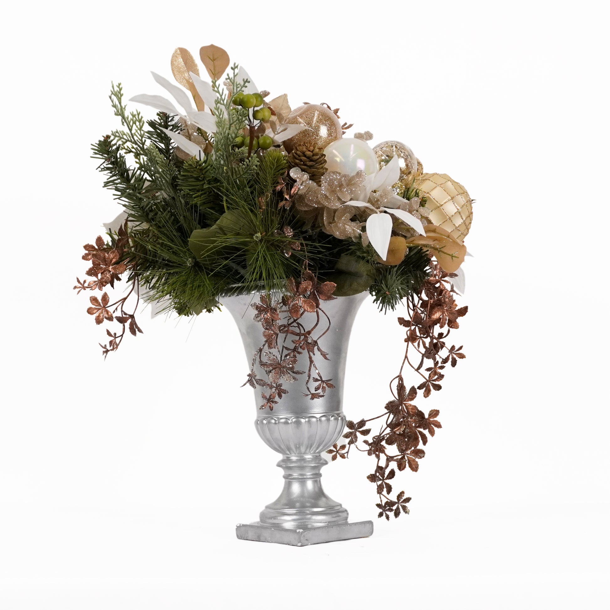 ゴージャスでホリデーシーズンにぴったりなホワイトポインセチアゴブレットアレンジ。クリスマスの定番の花であるポインセチアをメインに、ラメがふんだんにかかったグレープリーフやユーカリの葉、キラキラしたオーナメントを用いて、ゴブレットにアレンジすることでさらに高級感が溢れます。クリスマスパーティーなど華やかな雰囲気の演出にぴったりです。