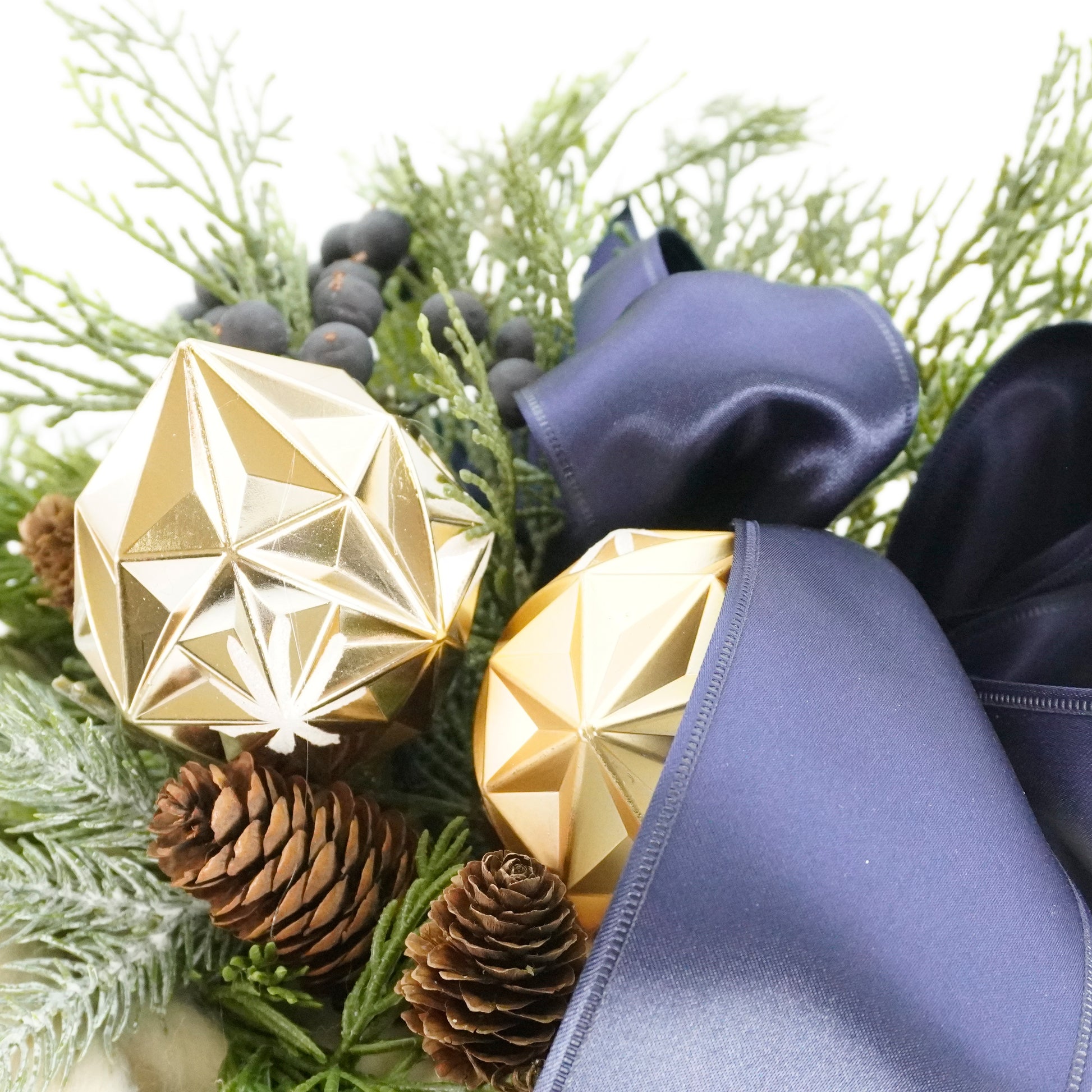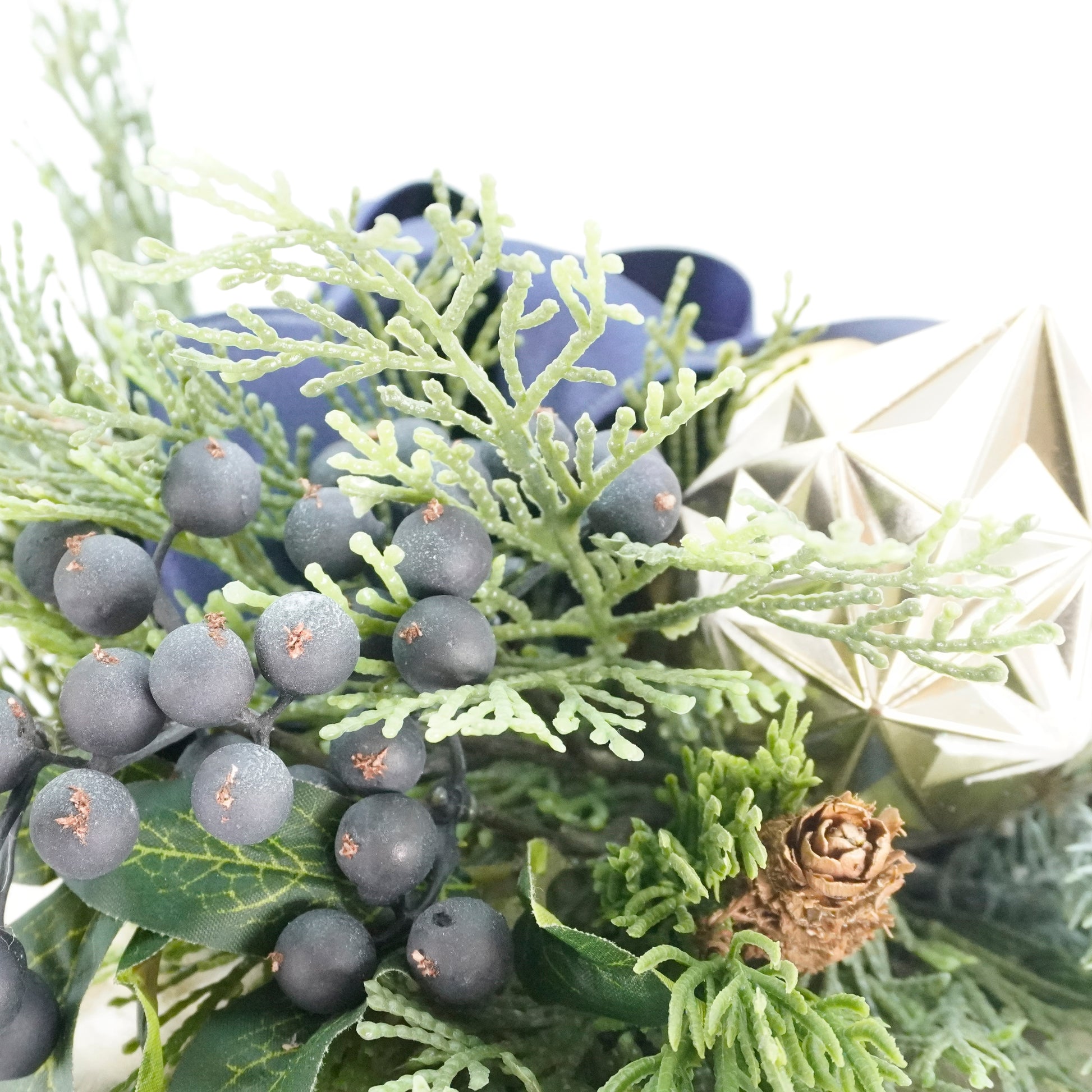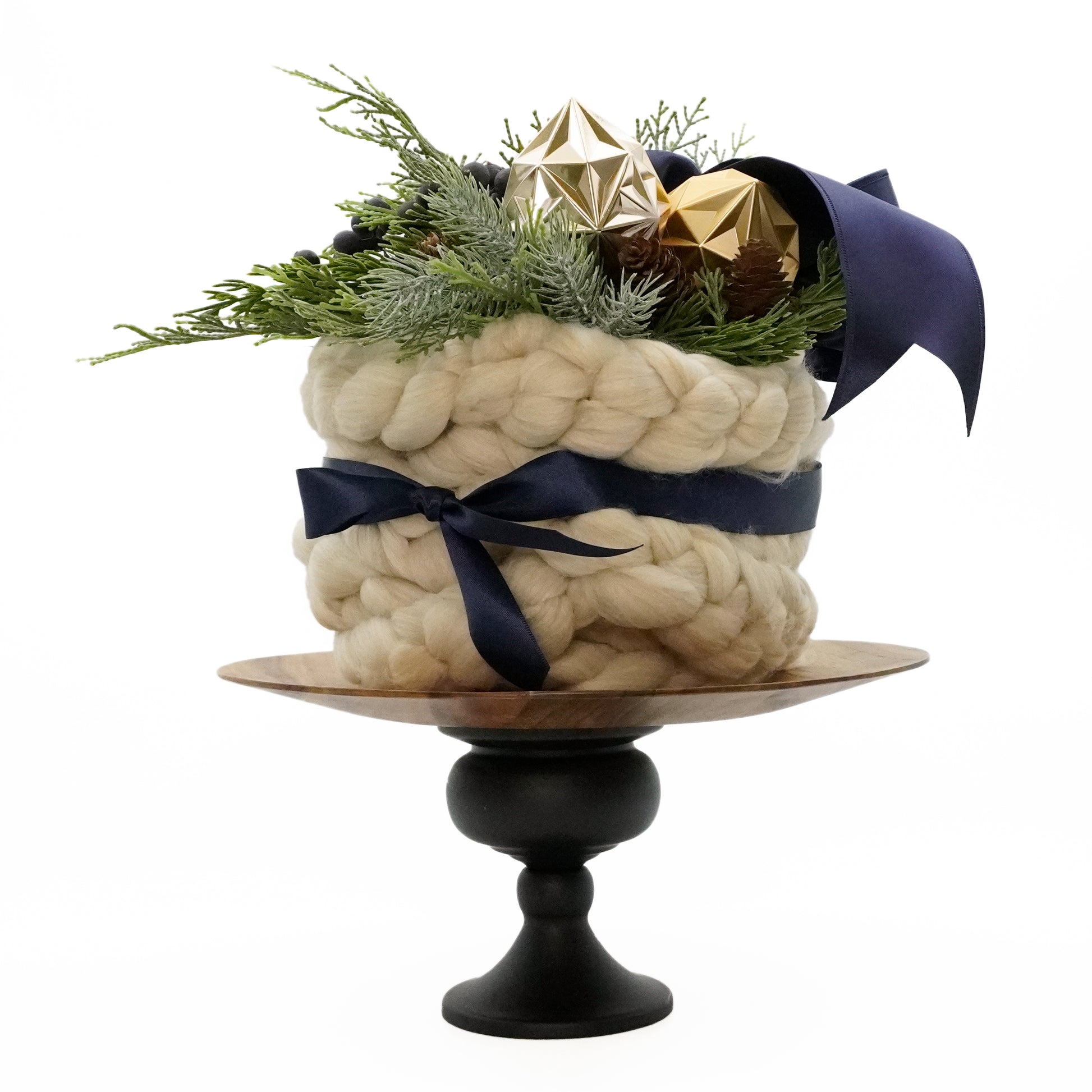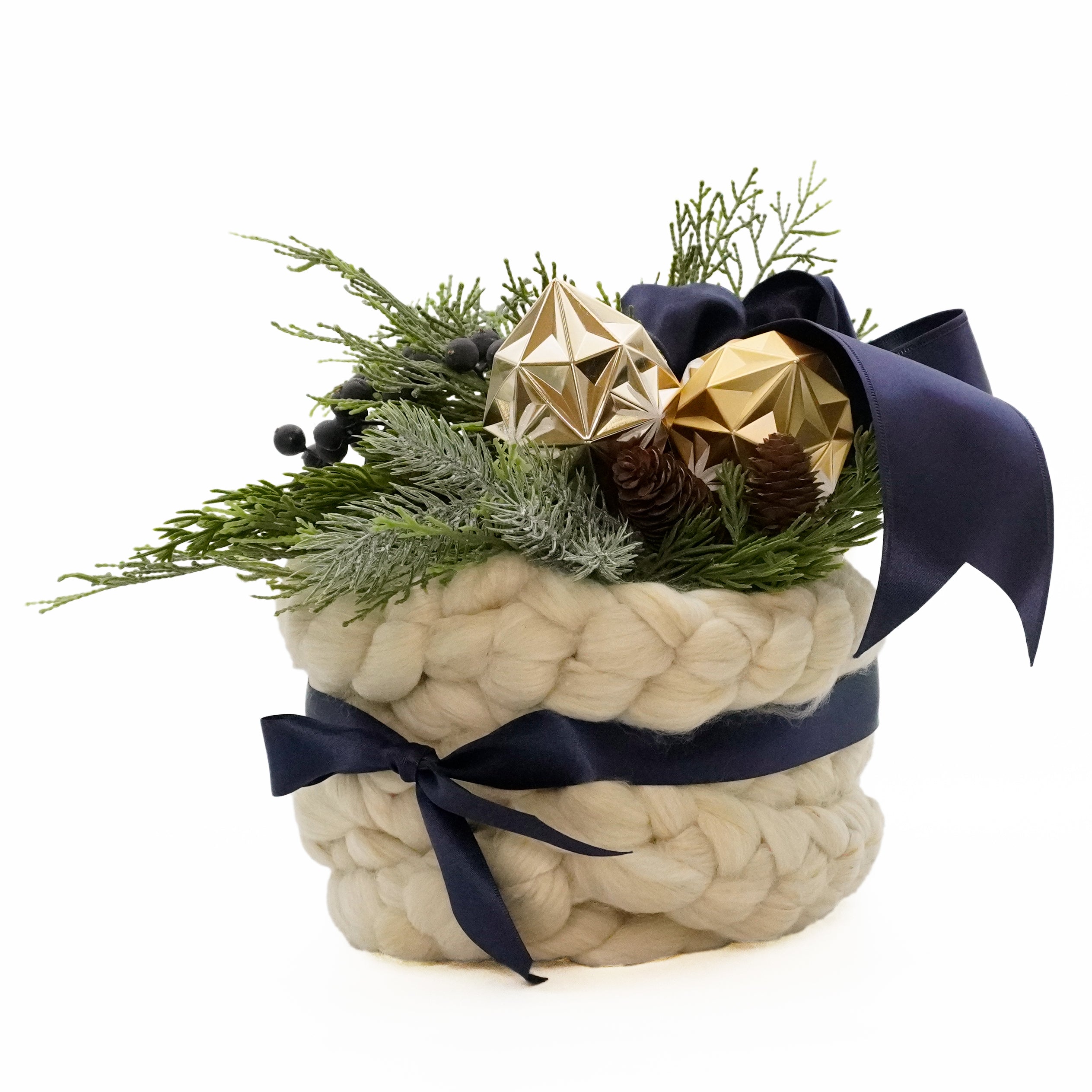 ウールアレンジは、もこもこした印象で可愛らしさを演出。編み込んだ毛糸が温かさをもたらし、ナチュラルな雰囲気を表現。紺色のリボンで大人シックにまとめあげ、あなたのお部屋を華やかに彩ります。クリスマスシーズンにぴったりのアイテムです。<注:フラワースタンドは付属しません。>