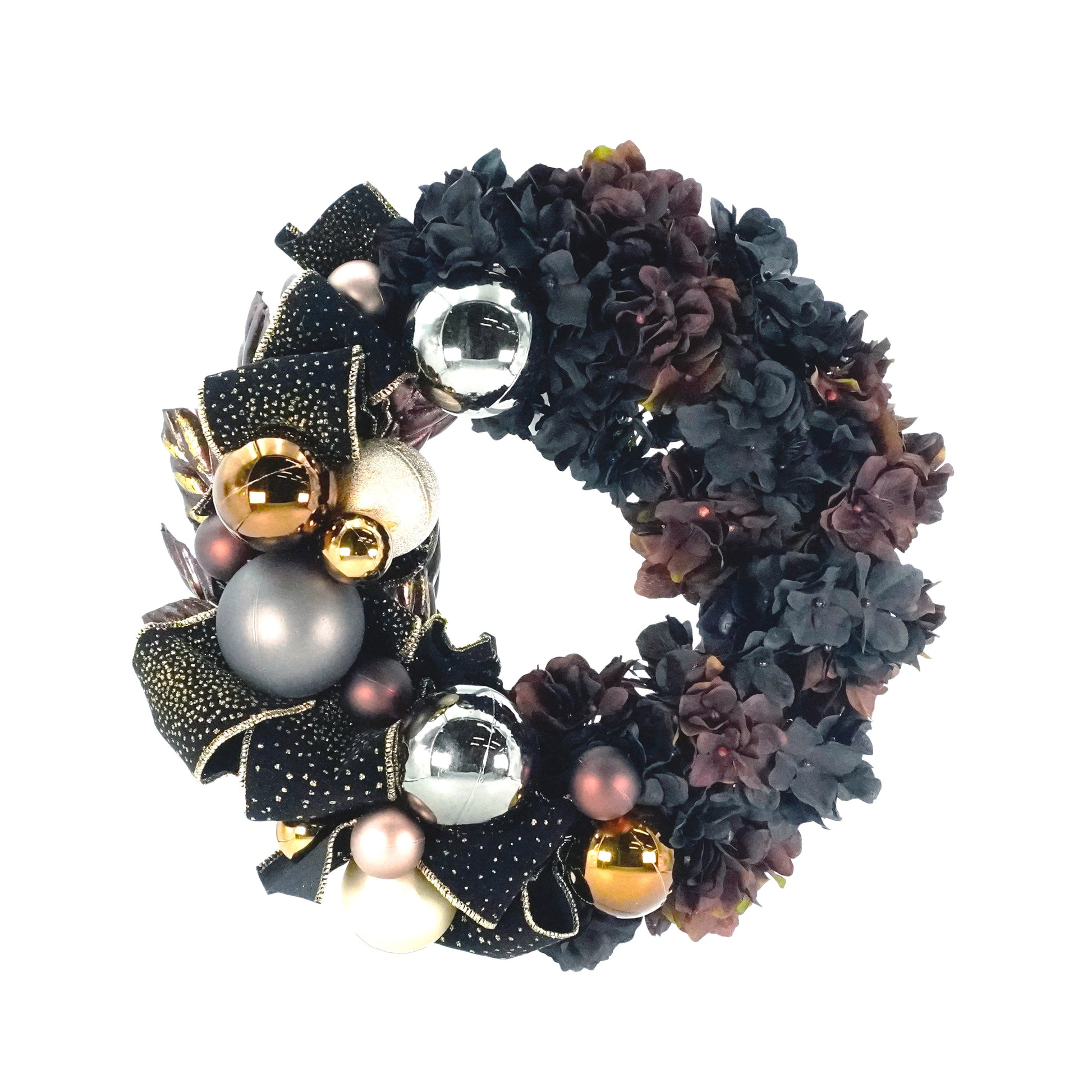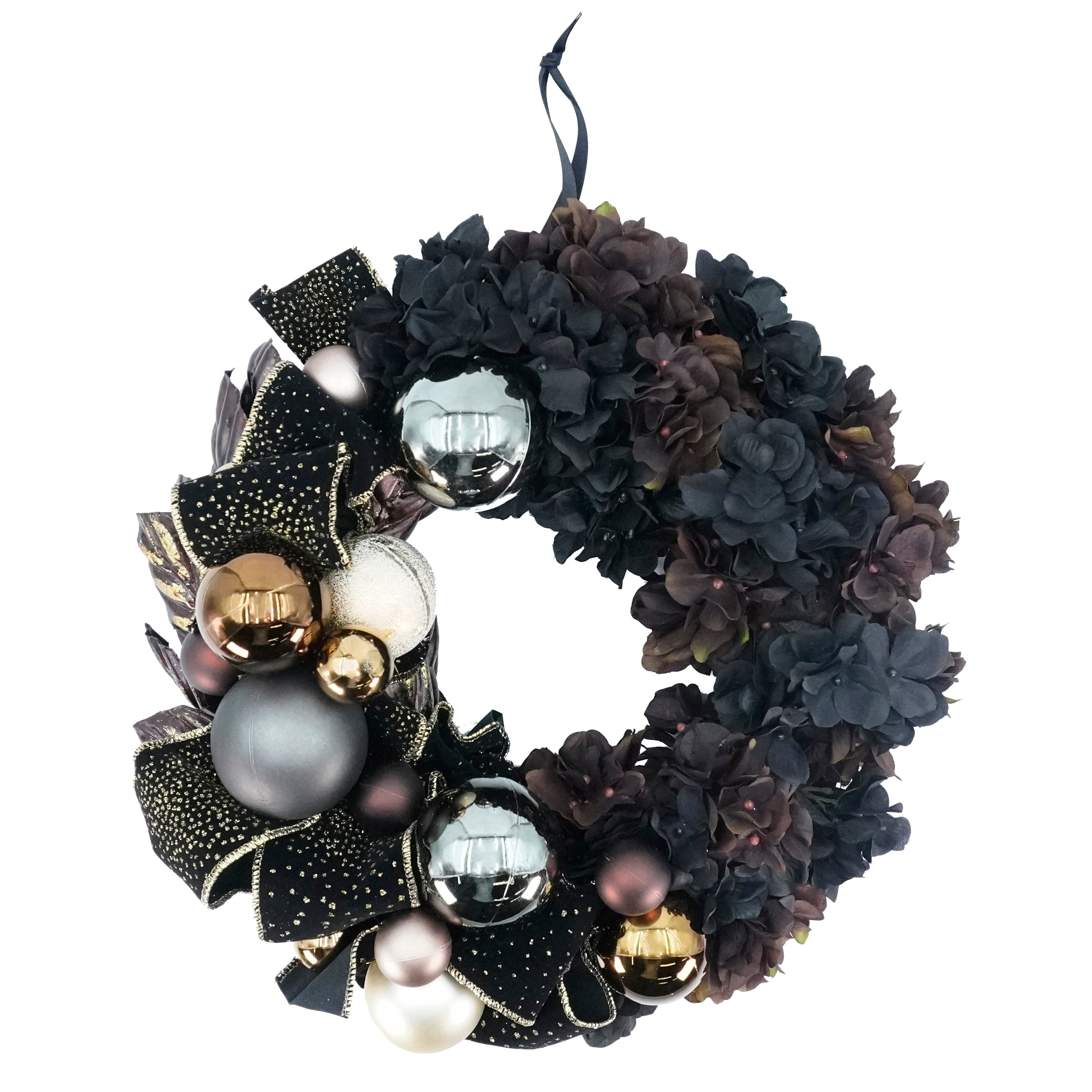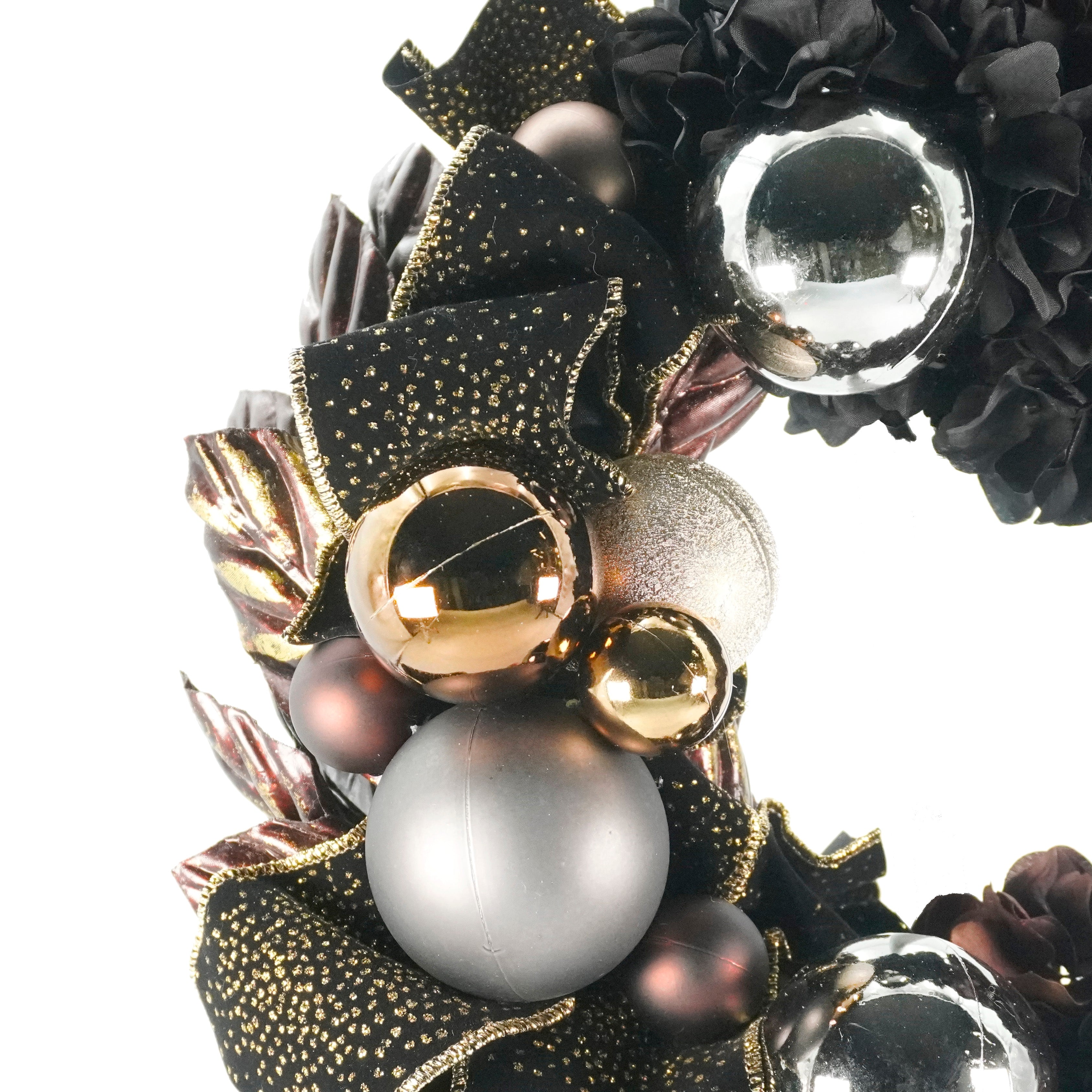 ダークカラーの中でもブラウンを取り入れることで、上品かつシックな雰囲気を演出します。ゴールドの模様が美しいベルベットのリボンにより、大人の雰囲気を醸し出し、お玄関をゴージャスでラグジュアリーな空間に変えてくれます。クールでオシャレな印象を与えるリースです。