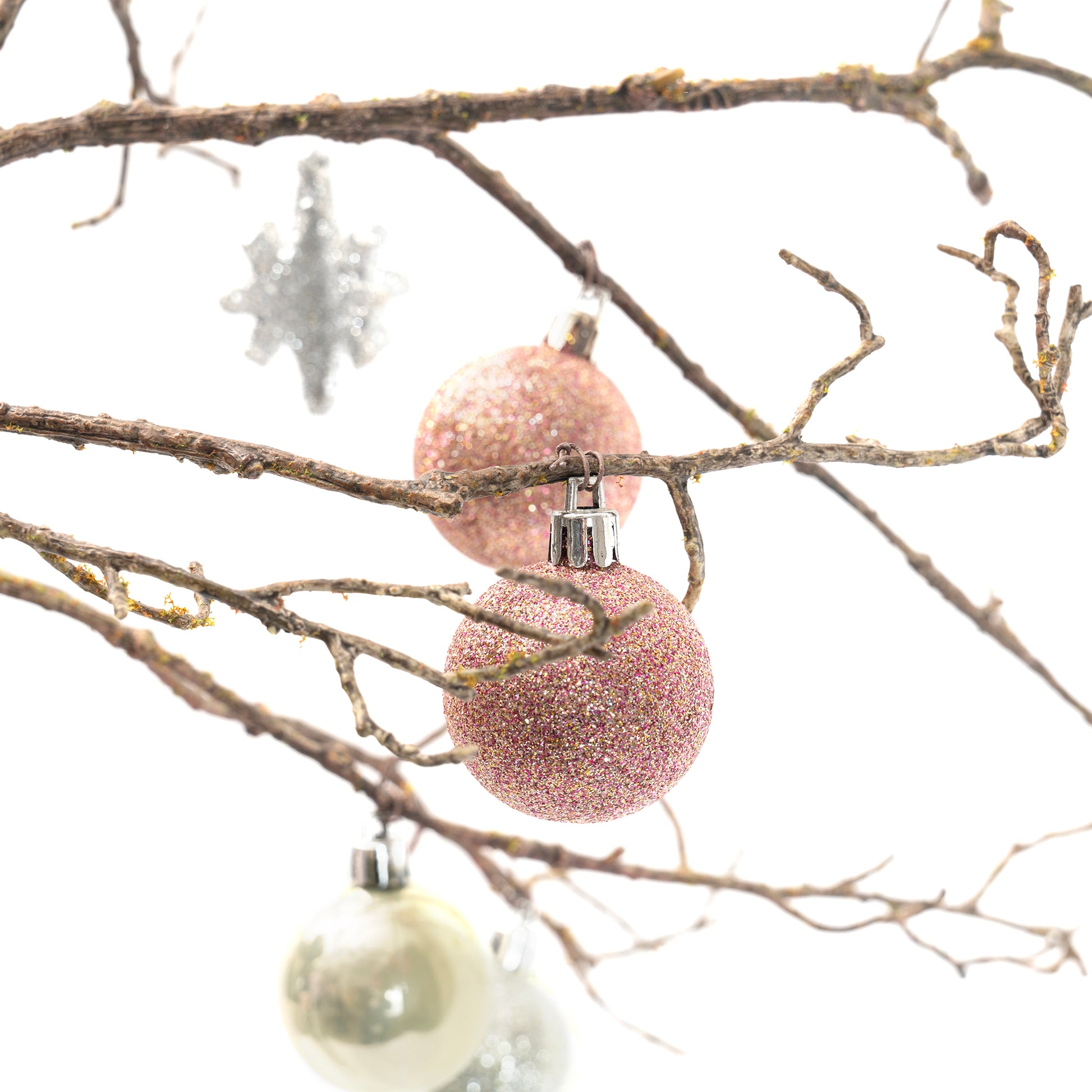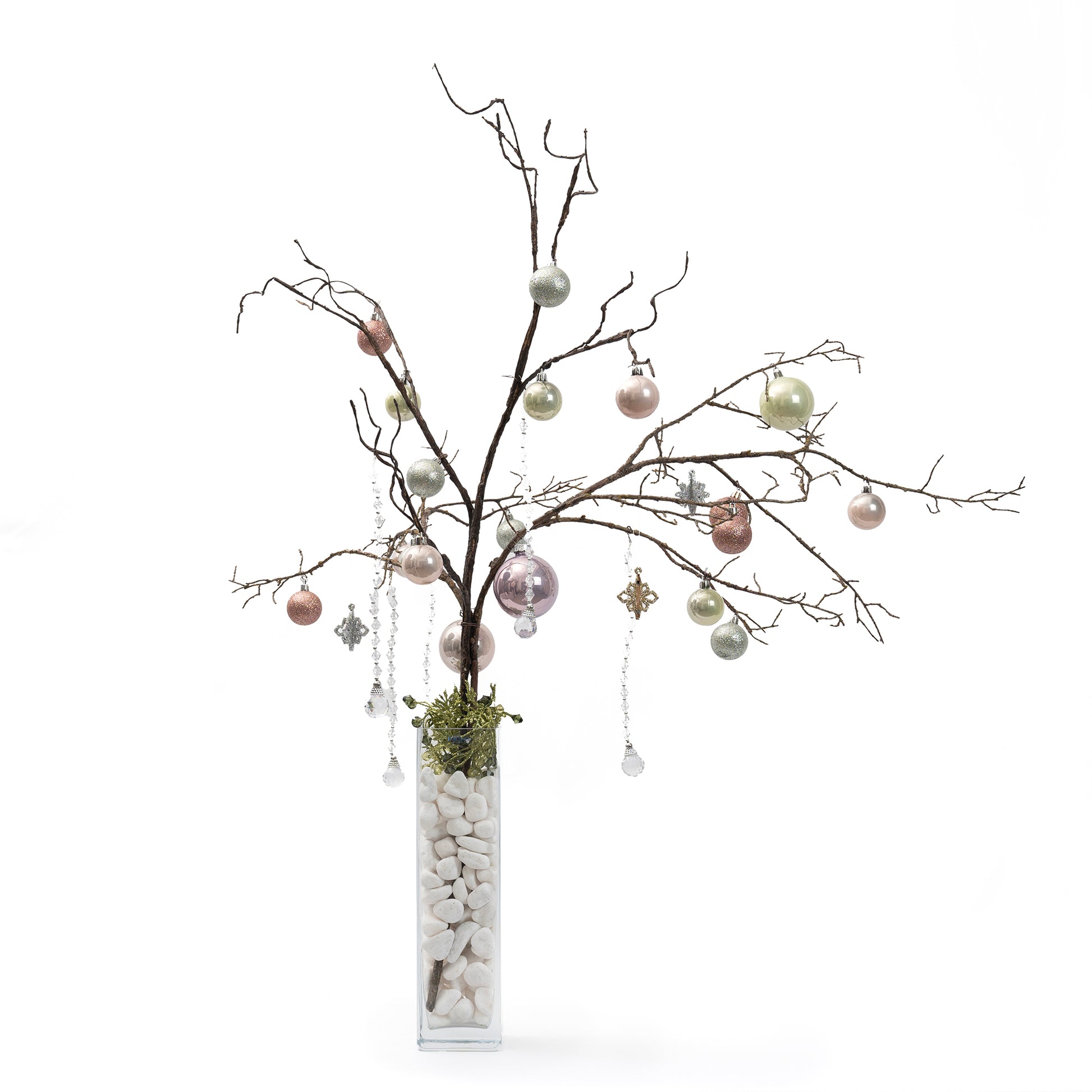 クリスマスなど華やかなイベントに飾り付けたいアレンジメント。キラキラ輝くオーナメントをいくつも枝に散りばめました。デコレーションが時折風に揺られながら煌めく様は、とてもロマンティック。存在感があるアイテムなので、デコレーションが寂しいと感じる空間や廊下、お店などにもおすすめです。