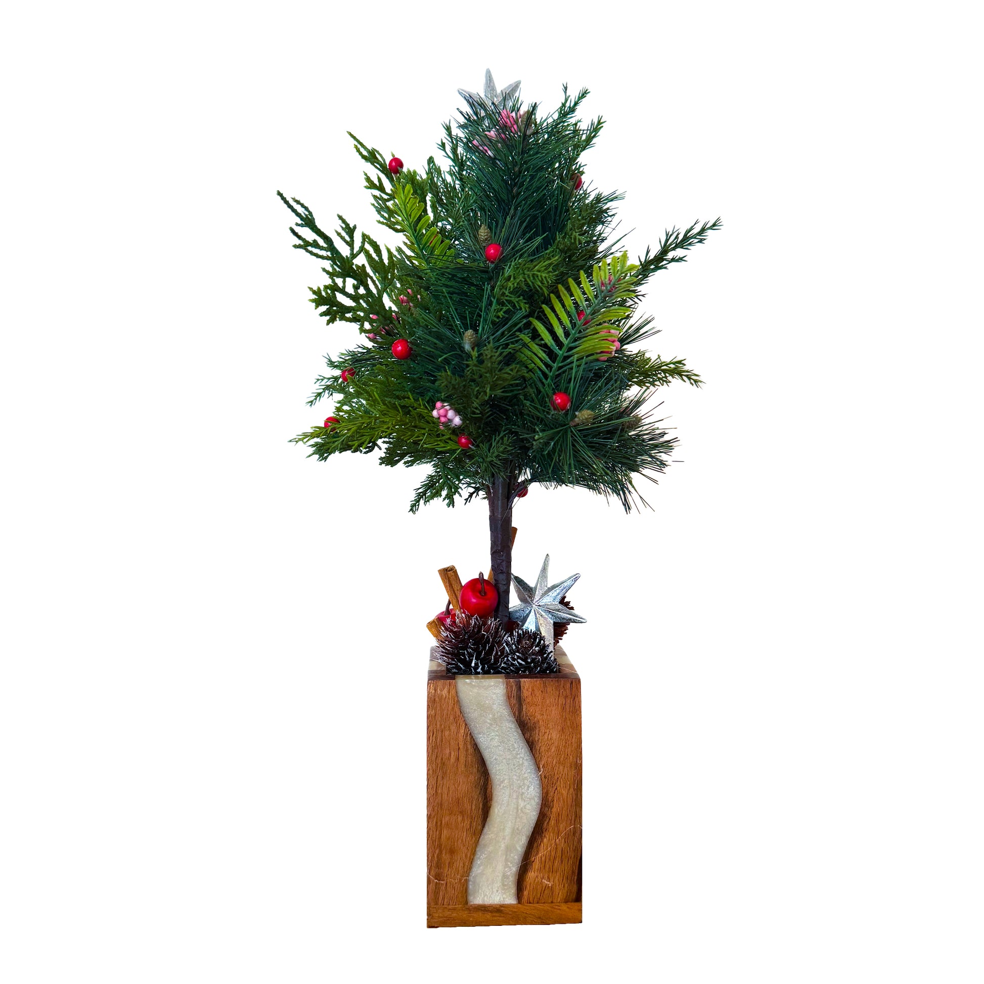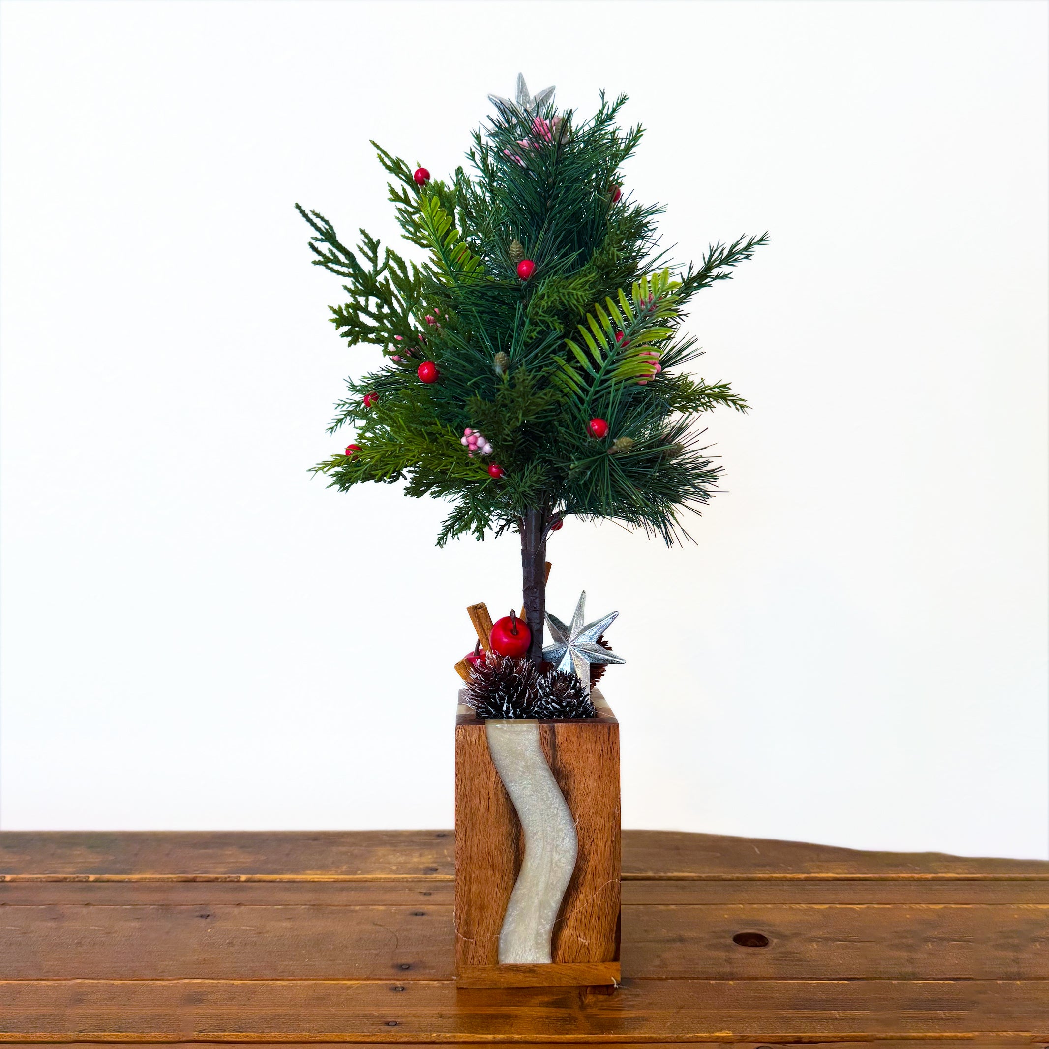 ウッドベースに樹脂加工が施された本格的な花器には、モミの木、ペッパーベリー、赤い実を贅沢にアレンジ。ツリーの根元にはノグルミやリンゴ、シナモン、松ぼっくり、煌めくシルバーのスターが所狭しと並び、トップにはシルバーのスターが輝きます。ミニサイズながらも存在感のある本格的なツリーです。もちろんお好みのオーナメントを追加でデコレーションすれば、あなただけのオリジナルツリーに。