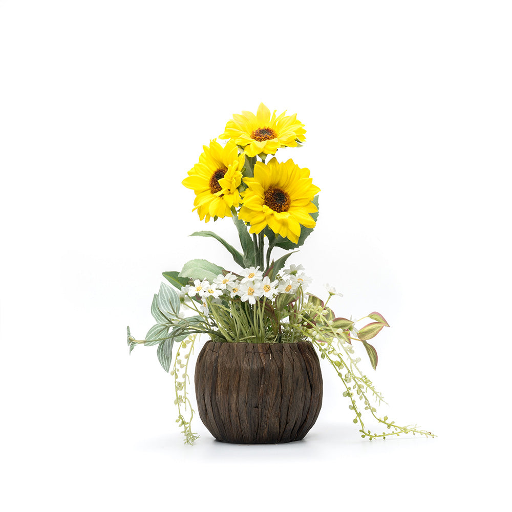 「情熱」「愛慕」が花言葉である向日葵。その言葉を反映するかのように、元気いっぱいのイエローが際立つアレンジです。お部屋の彩度も上がりそうな鮮やかさがポイントです。洗練されたデイジー、グリーンネックレスが優雅な印象を纏い、全体としてはフレッシュかつ愛らしささえも感じさせます。夏だけでなく、気分を上げたい時にもおすすめアレンジメントです。